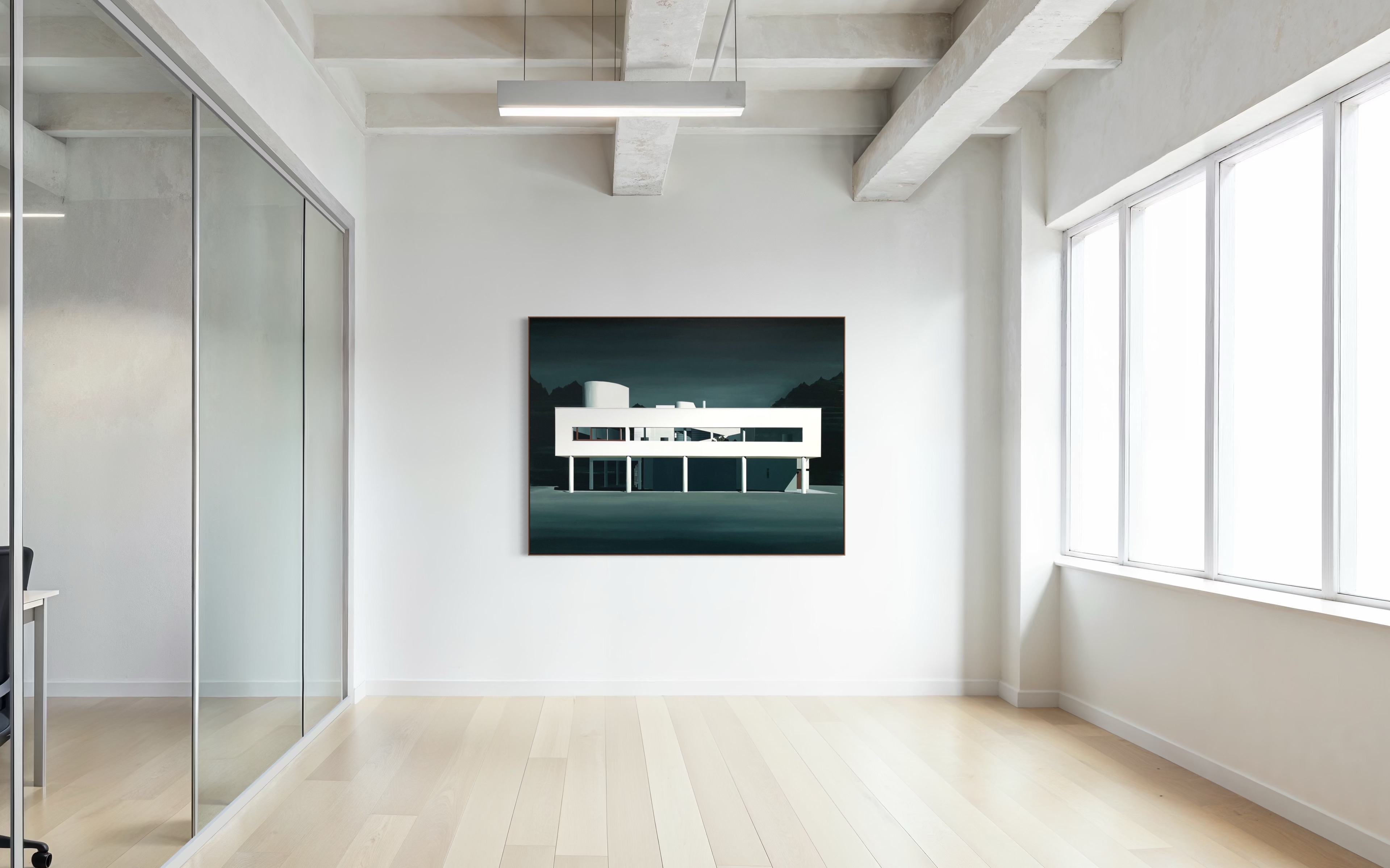 Modern Utopia is an evocative artwork that centers on the iconic Villa Savoye, a seminal piece of architecture by the Swiss-born visionary Le Corbusier. Designed with the intention of enhancing the happiness of its residents, Villa Savoye embodies Le Corbusier's utopian vision of living spaces that harmonize with modern life. The artwork highlights this architectural masterpiece through a ‘spotlight’ effect, casting the building in a cinematic light that heightens its presence and dramatizes its form.