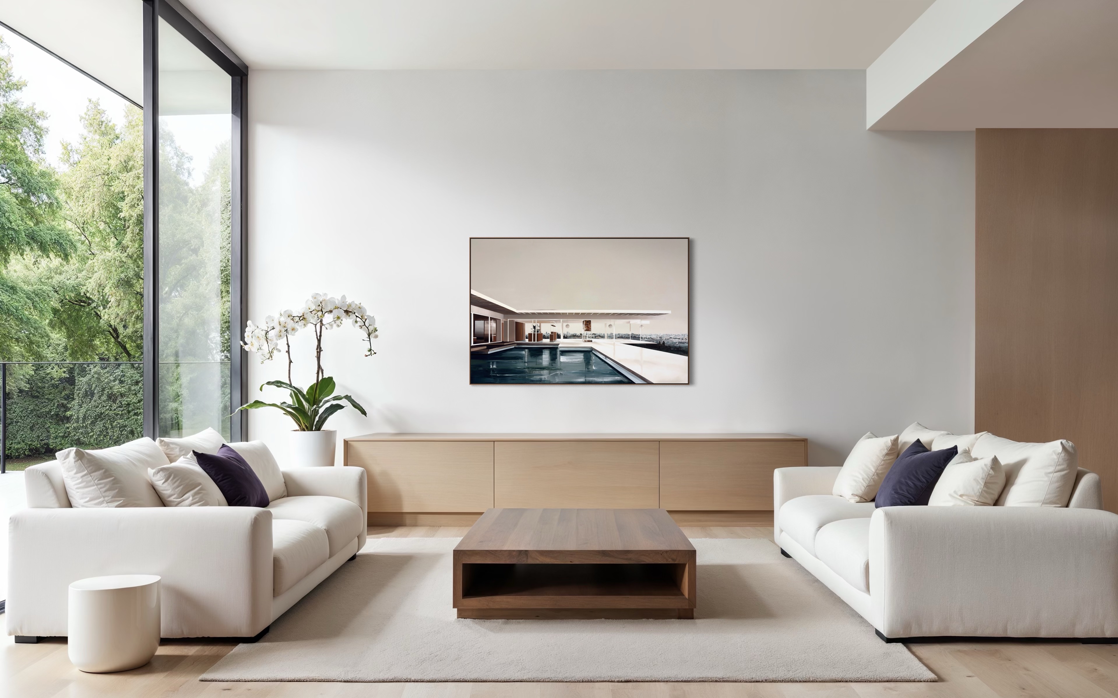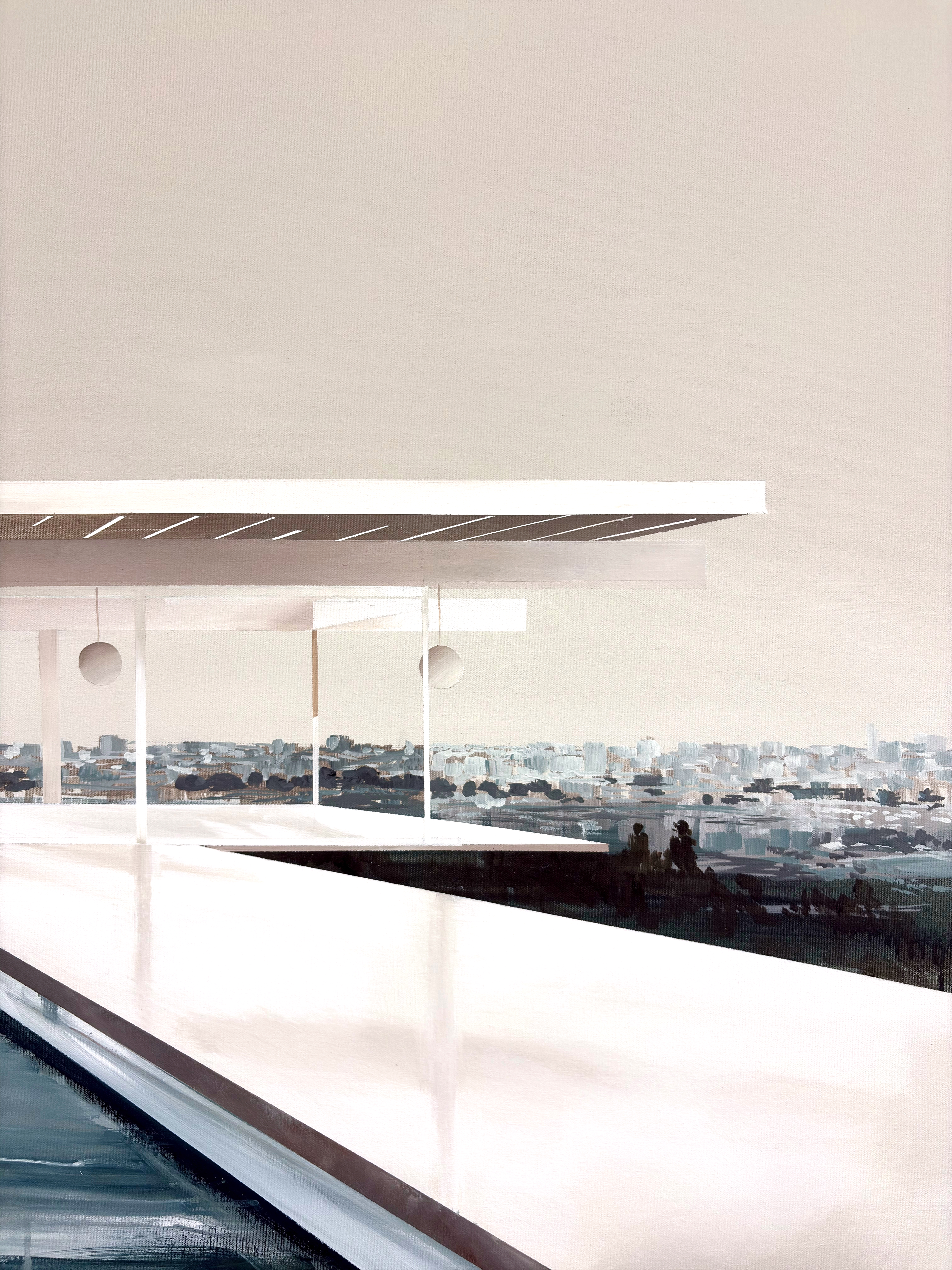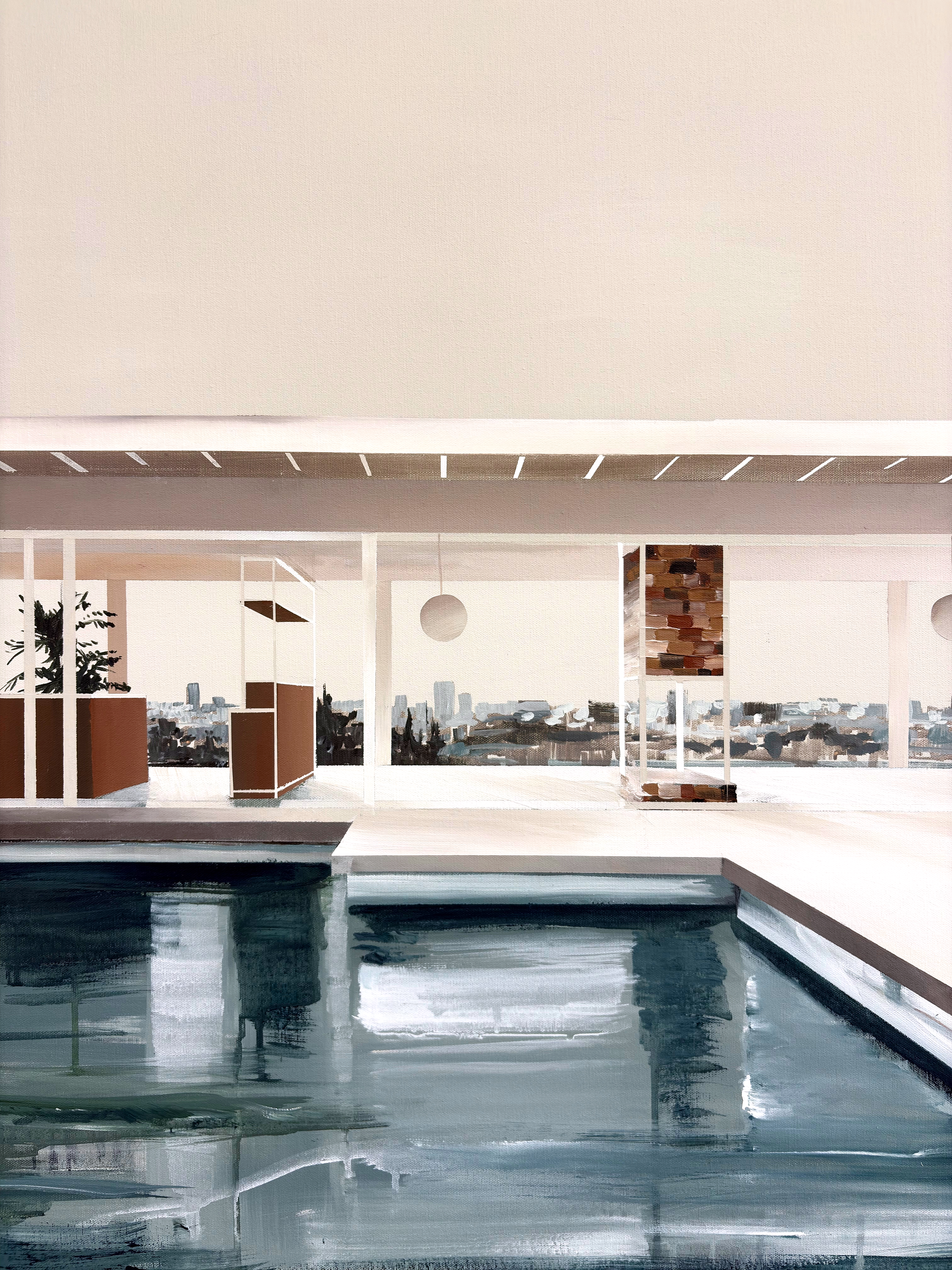In Dreamscape, the villa is bathed in soft beige tones, with sunlight streaming through its transparent walls. The pool reflects both the architecture and the sky, while the hazy expanse of Los Angeles stretches into the horizon like a distant memory. The looseness of the water and background contrasts with the precise geometry of this modernist classic, blurring the line between reality and imagination.