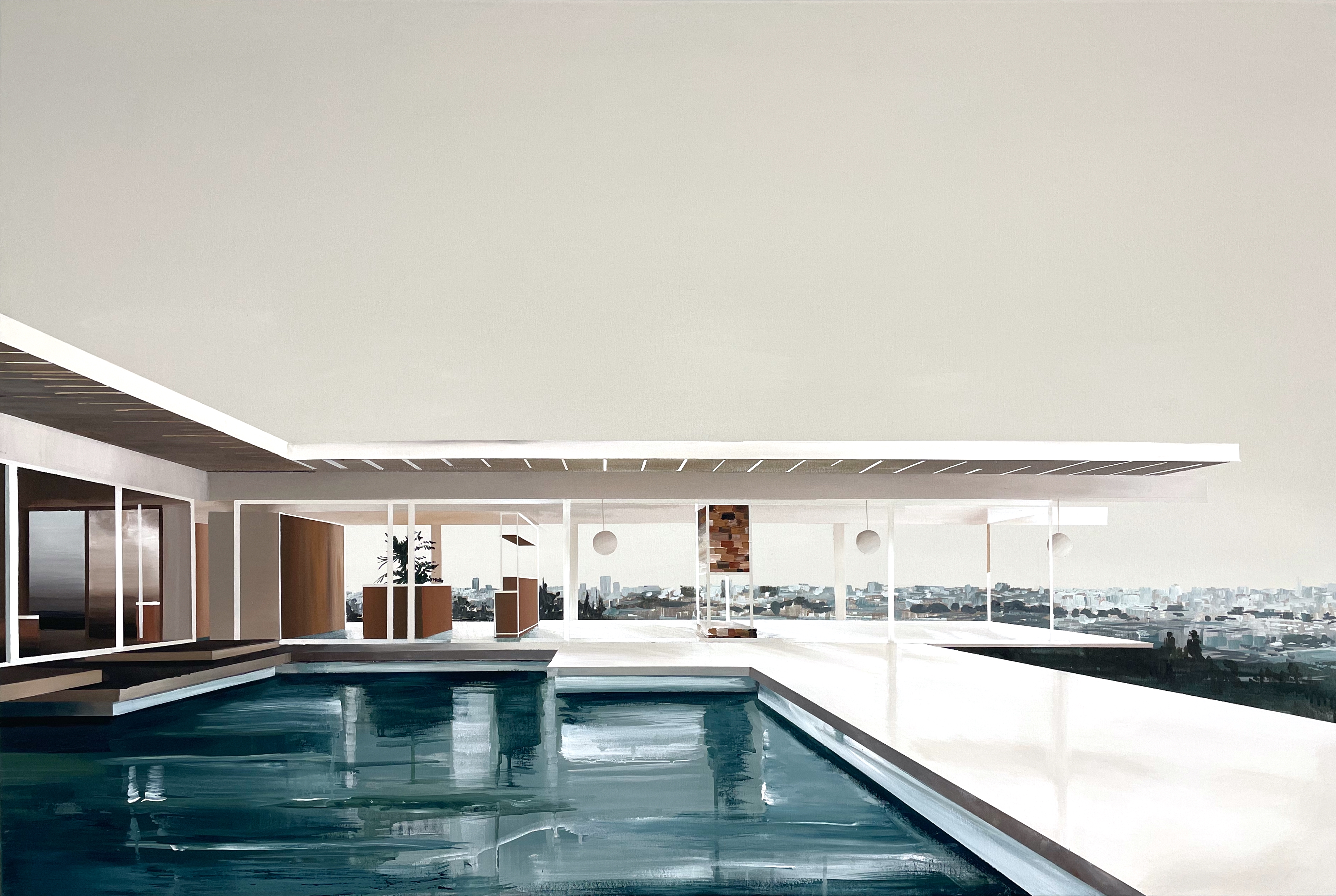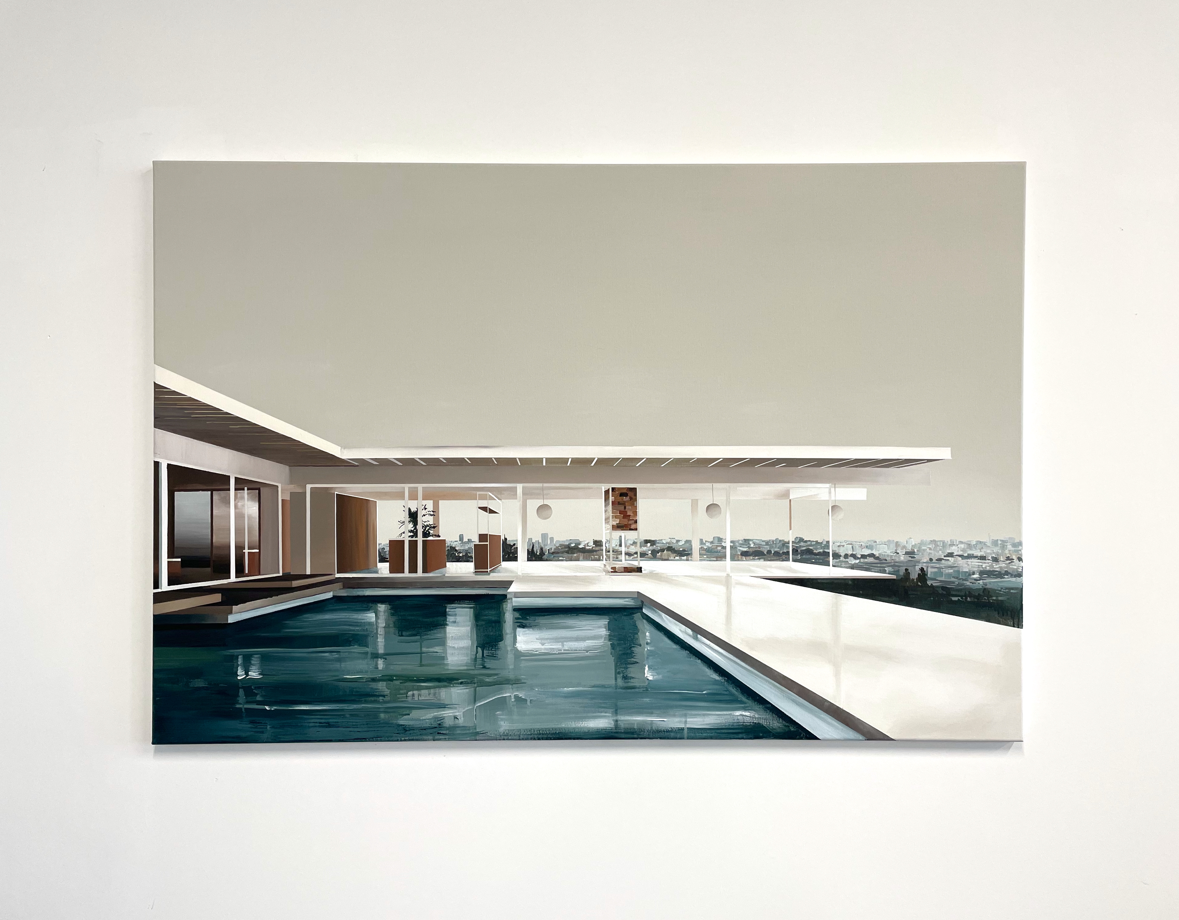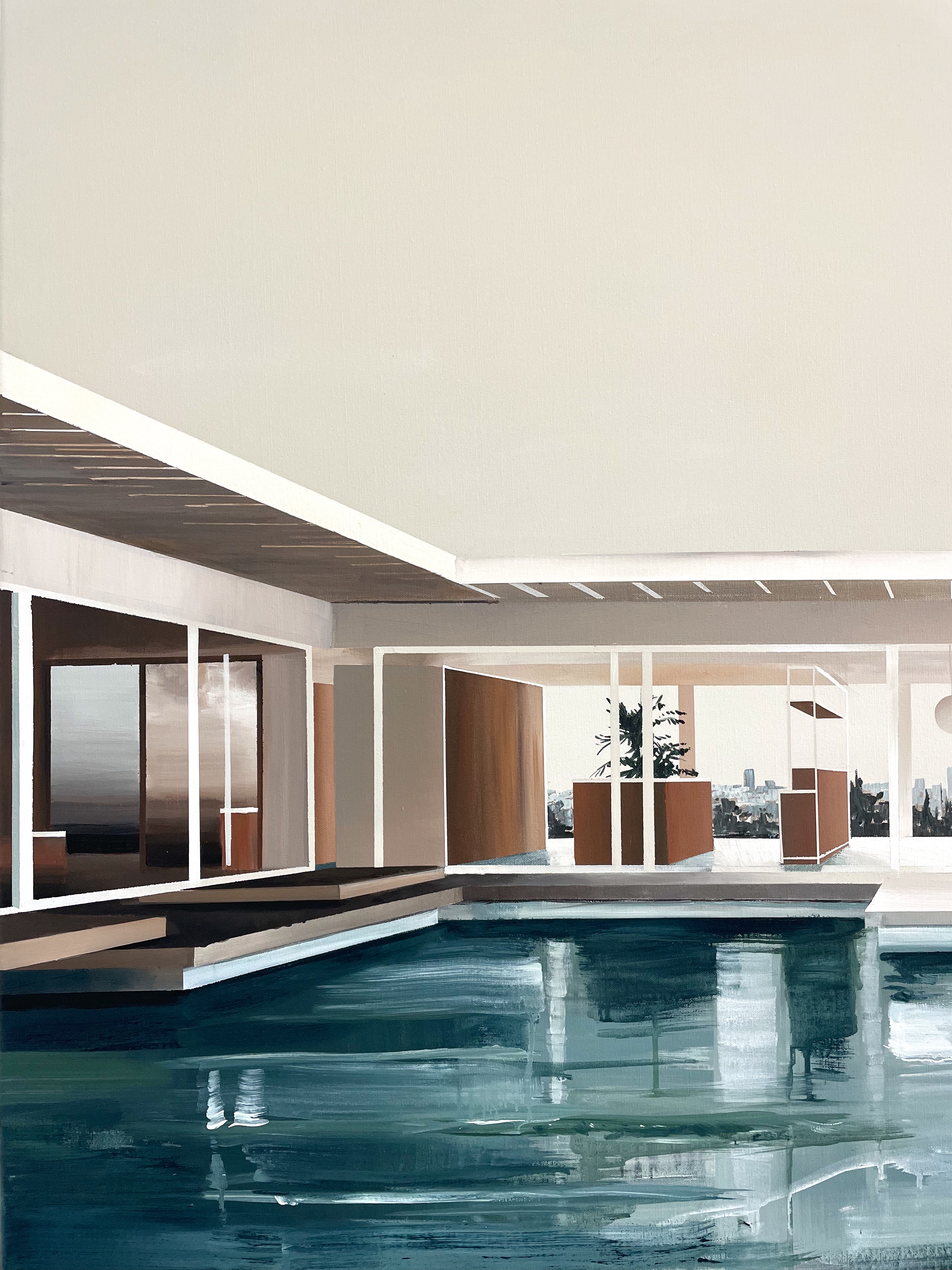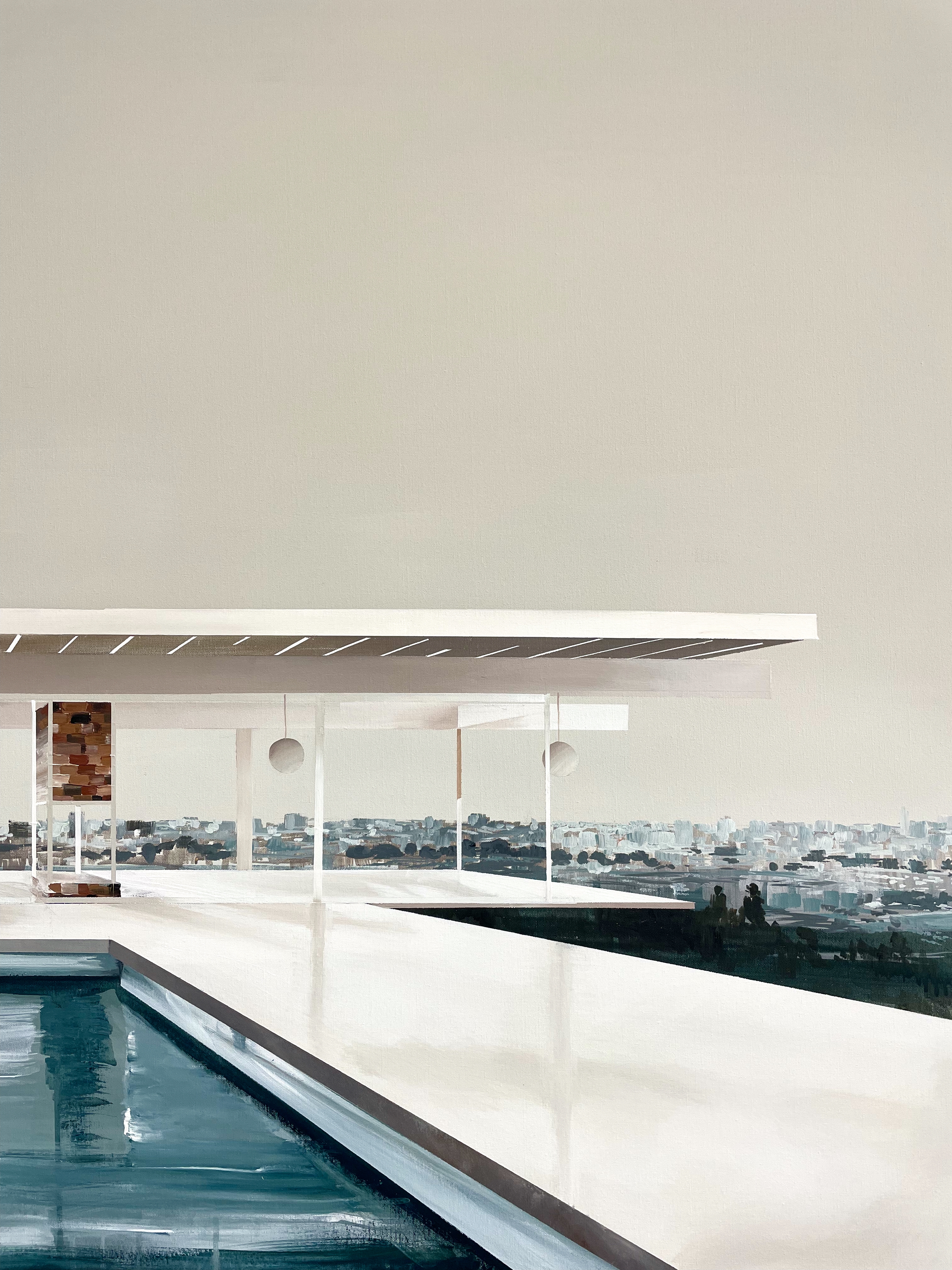 In Dreamscape, the villa is bathed in soft beige tones, with sunlight streaming through its transparent walls. The pool reflects both the architecture and the sky, while the hazy expanse of Los Angeles stretches into the horizon like a distant memory. The looseness of the water and background contrasts with the precise geometry of this modernist classic, blurring the line between reality and imagination.