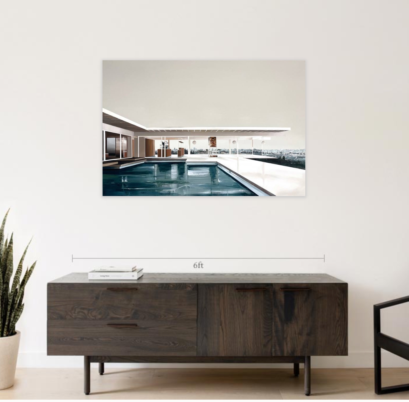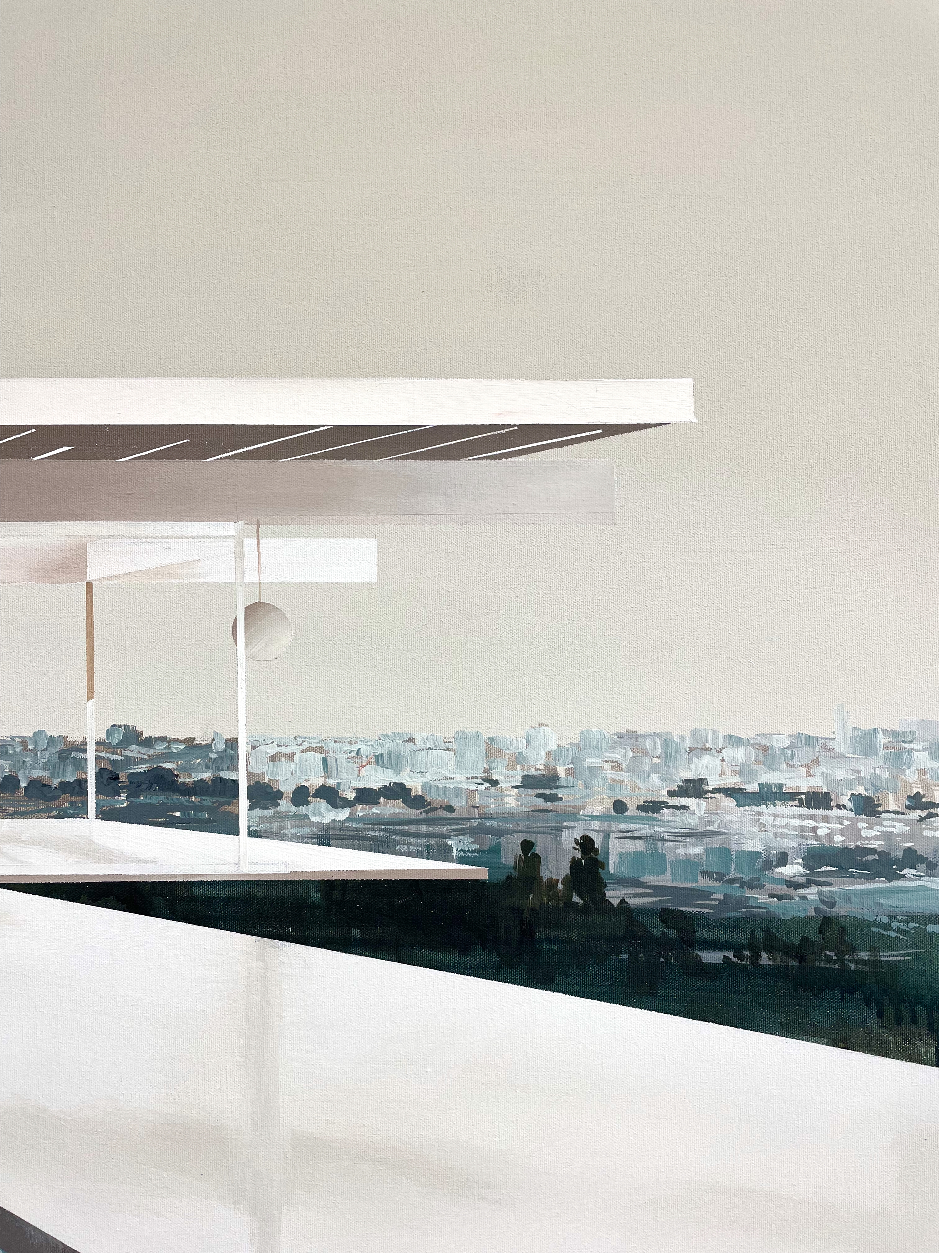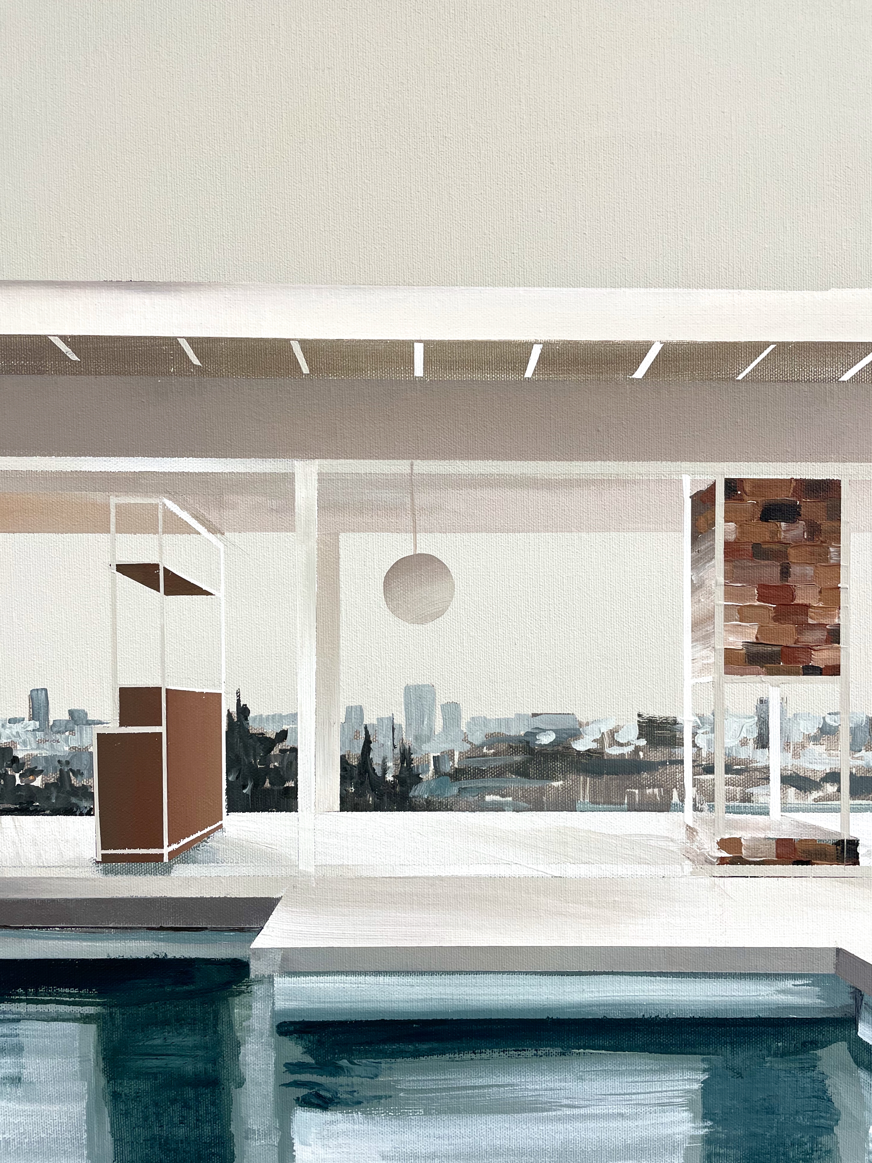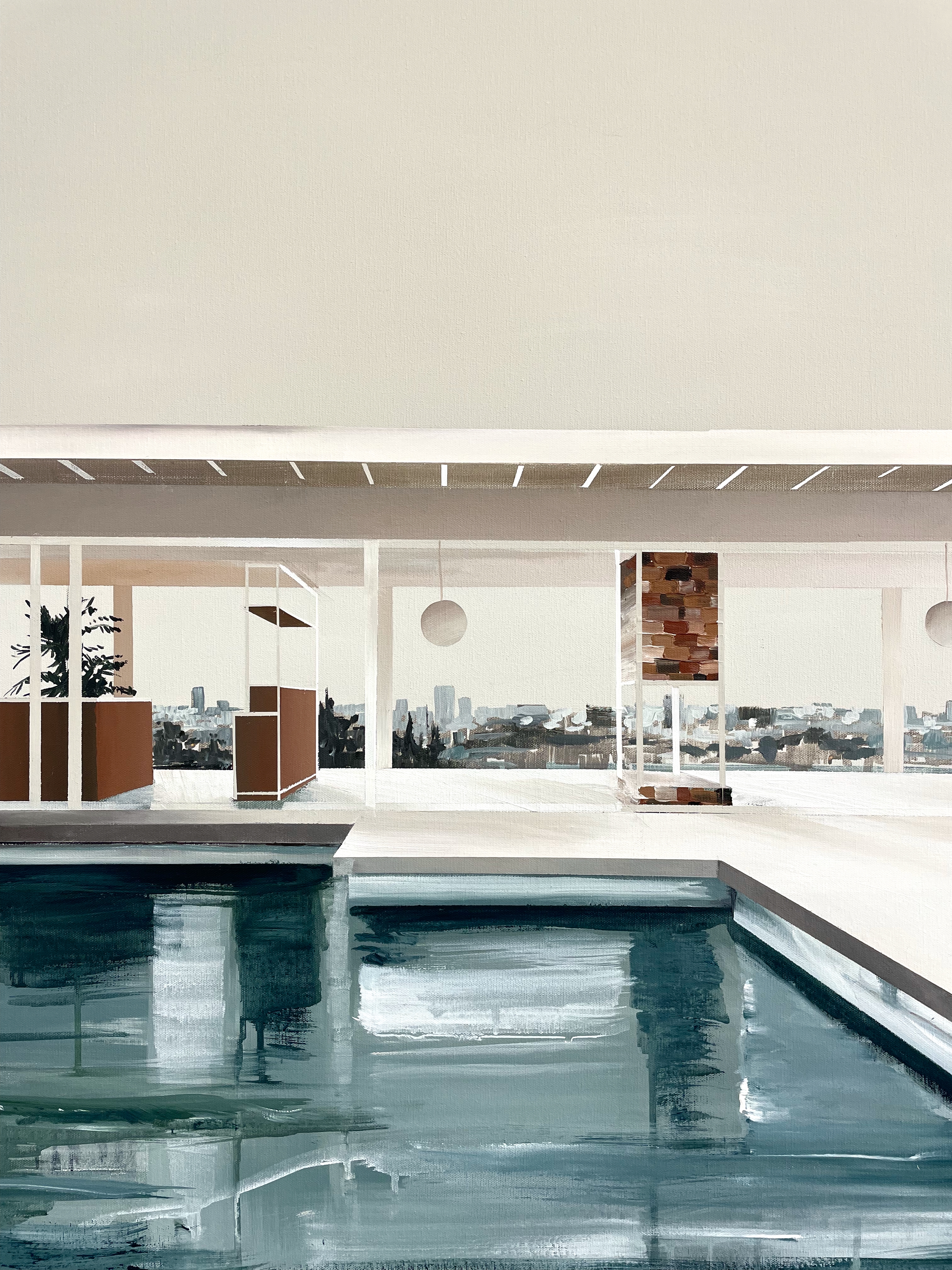 In Dreamscape, the villa is bathed in soft beige tones, with sunlight streaming through its transparent walls. The pool reflects both the architecture and the sky, while the hazy expanse of Los Angeles stretches into the horizon like a distant memory. The looseness of the water and background contrasts with the precise geometry of this modernist classic, blurring the line between reality and imagination.