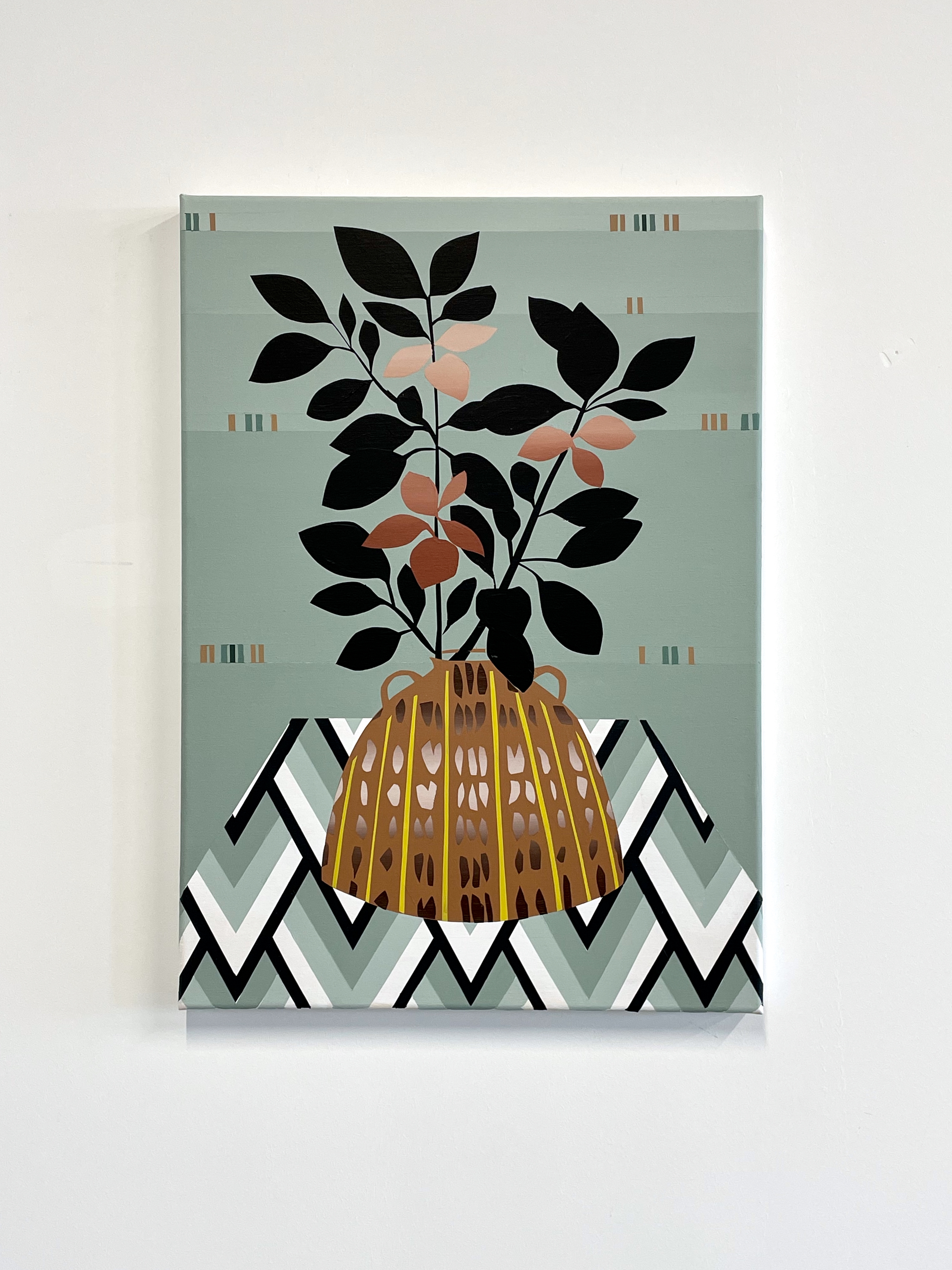 Each piece features a monumental, lush plant anchored in a unique pot – some natural, made of wood, marble, or glass; others adorned with bold graphic patterns that subtly nod to retro design and invite a longer gaze. The tables beneath the plants also play an essential role in the composition. Their intricate patterns and refined color transitions require technical precision and provide each painting with a dynamic foundation – rhythmic, layered, and always in dialogue with the plant above.