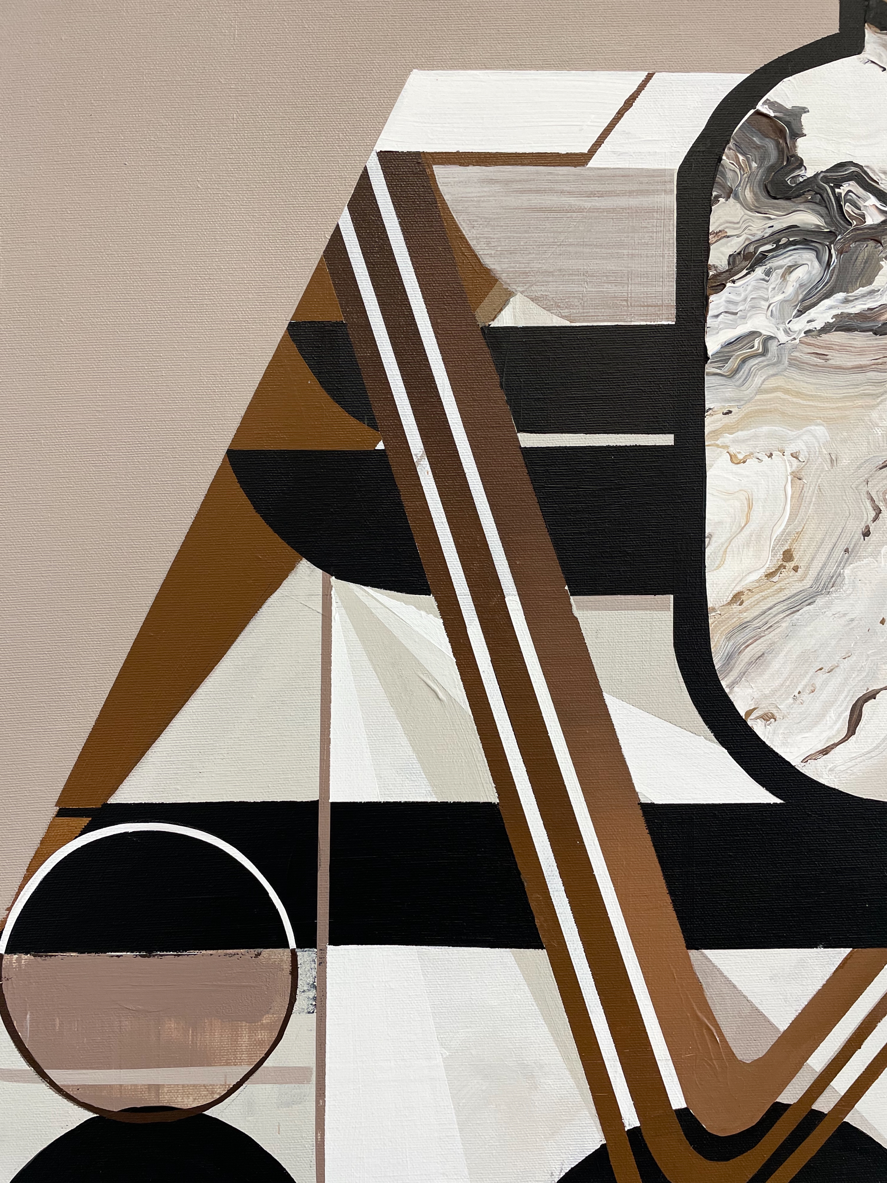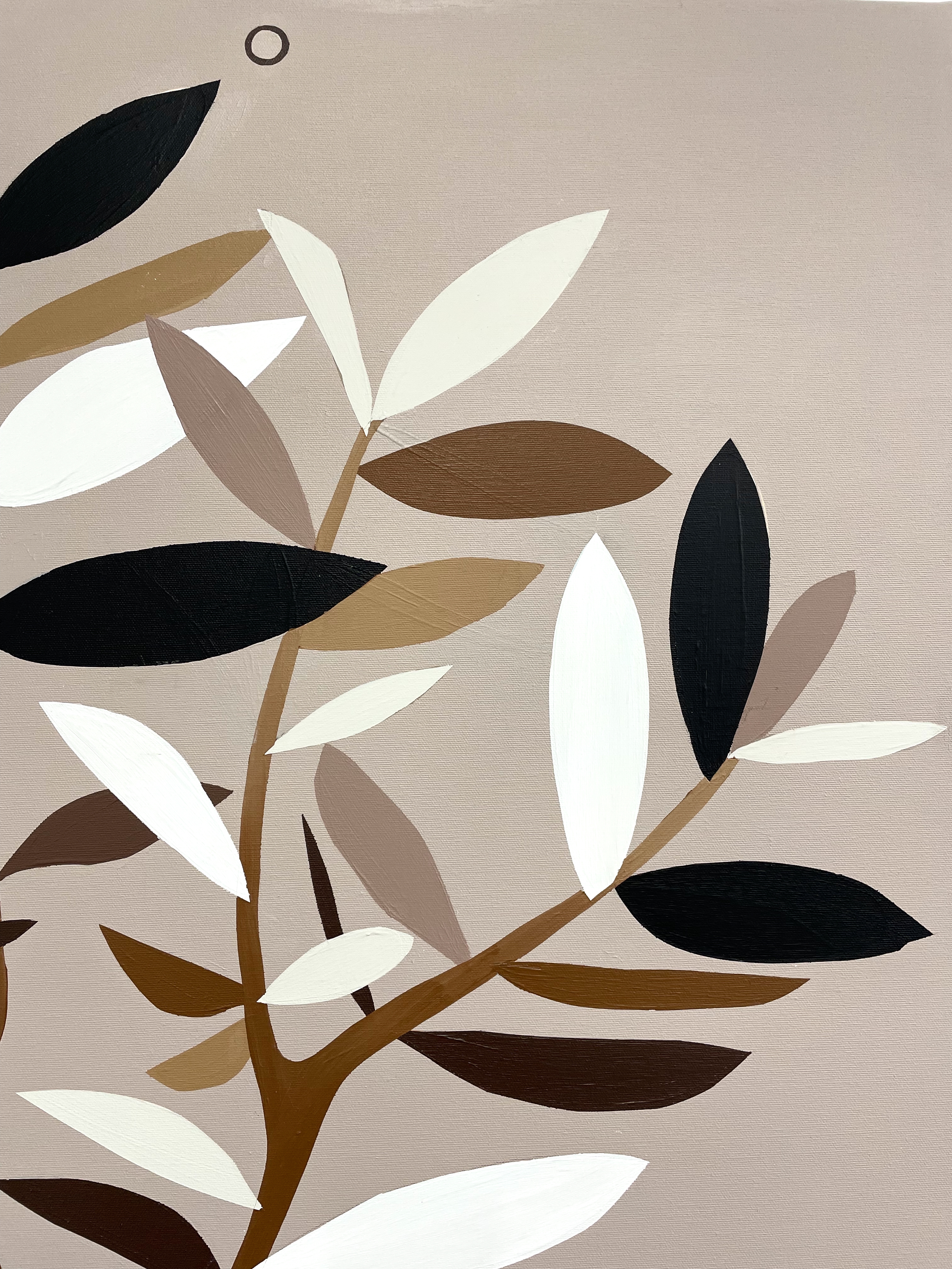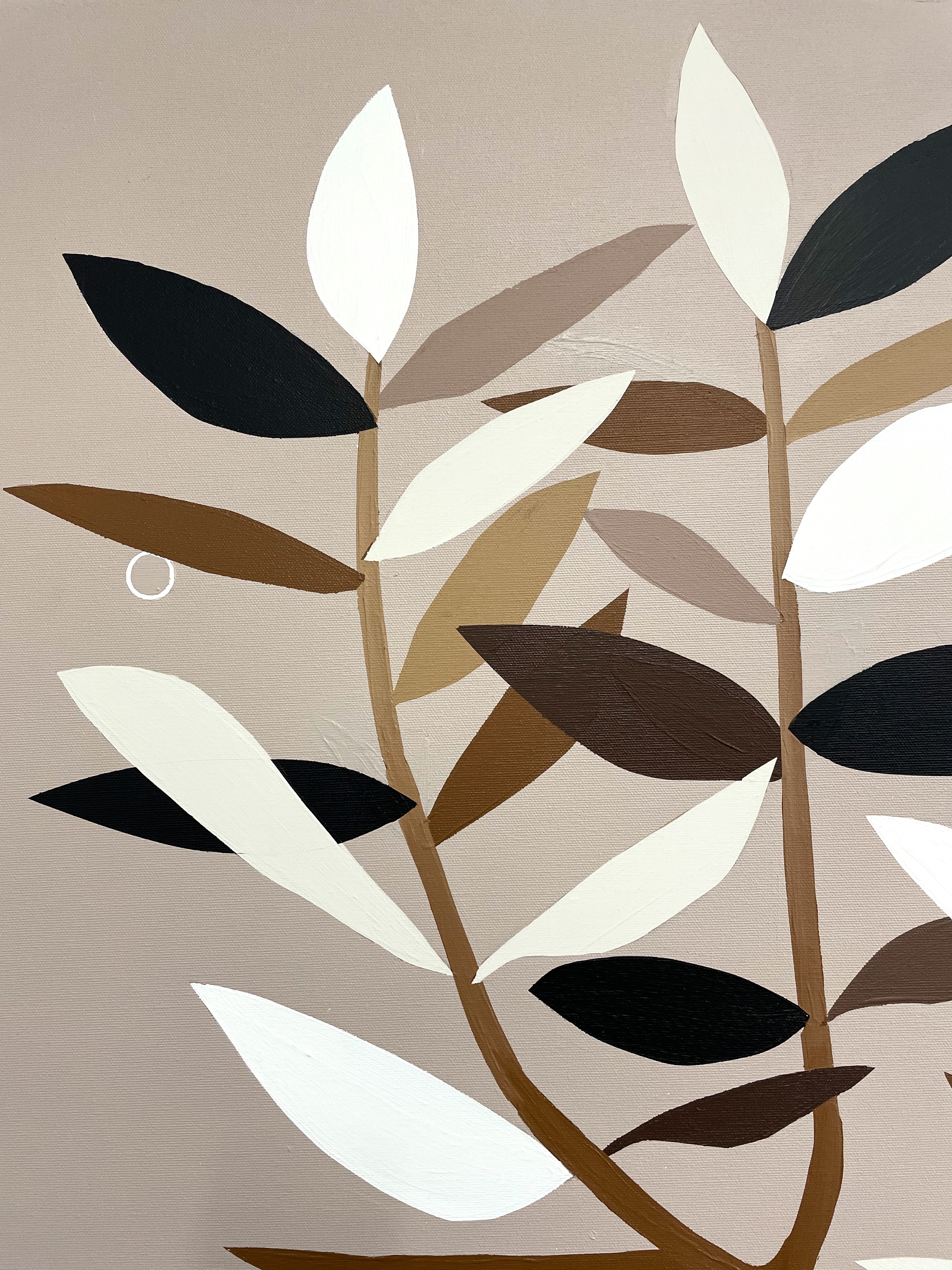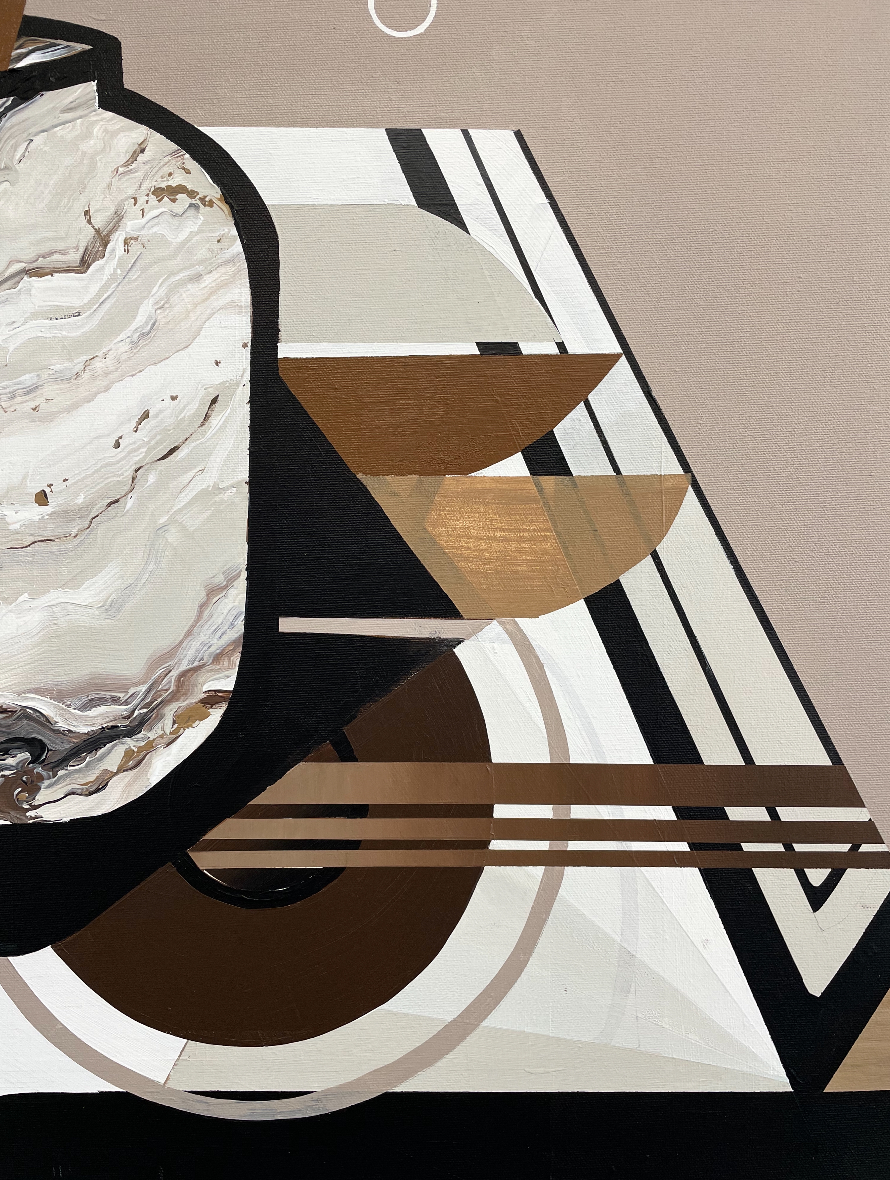 An olive branch rises elegantly from a white marble vase — a timeless symbol of peace, resilience, and connection. Its leaves, painted in gentle shades of white, ochre, taupe, and black, whisper stories of strength and serenity. Beneath it, a layered Art Deco–inspired pattern unfolds like a map of life. Circles echo the rhythm of the sun and moon, while lines weave above and beneath each other like paths crossing in unexpected ways. In hues of white, brown, ochre, and black, these patterns evoke the journeys we take — the encounters that surprise us, the detours that shape us.