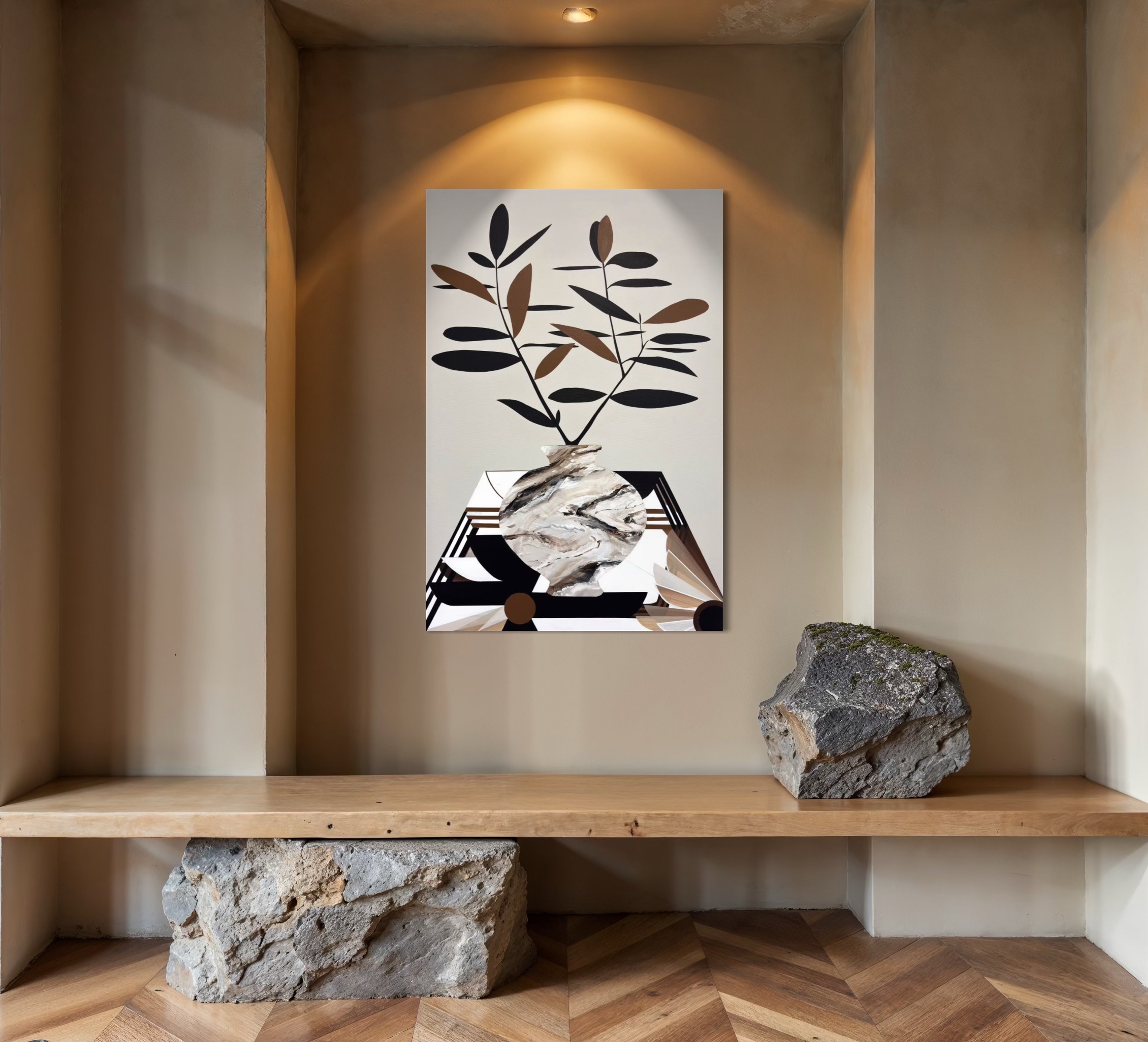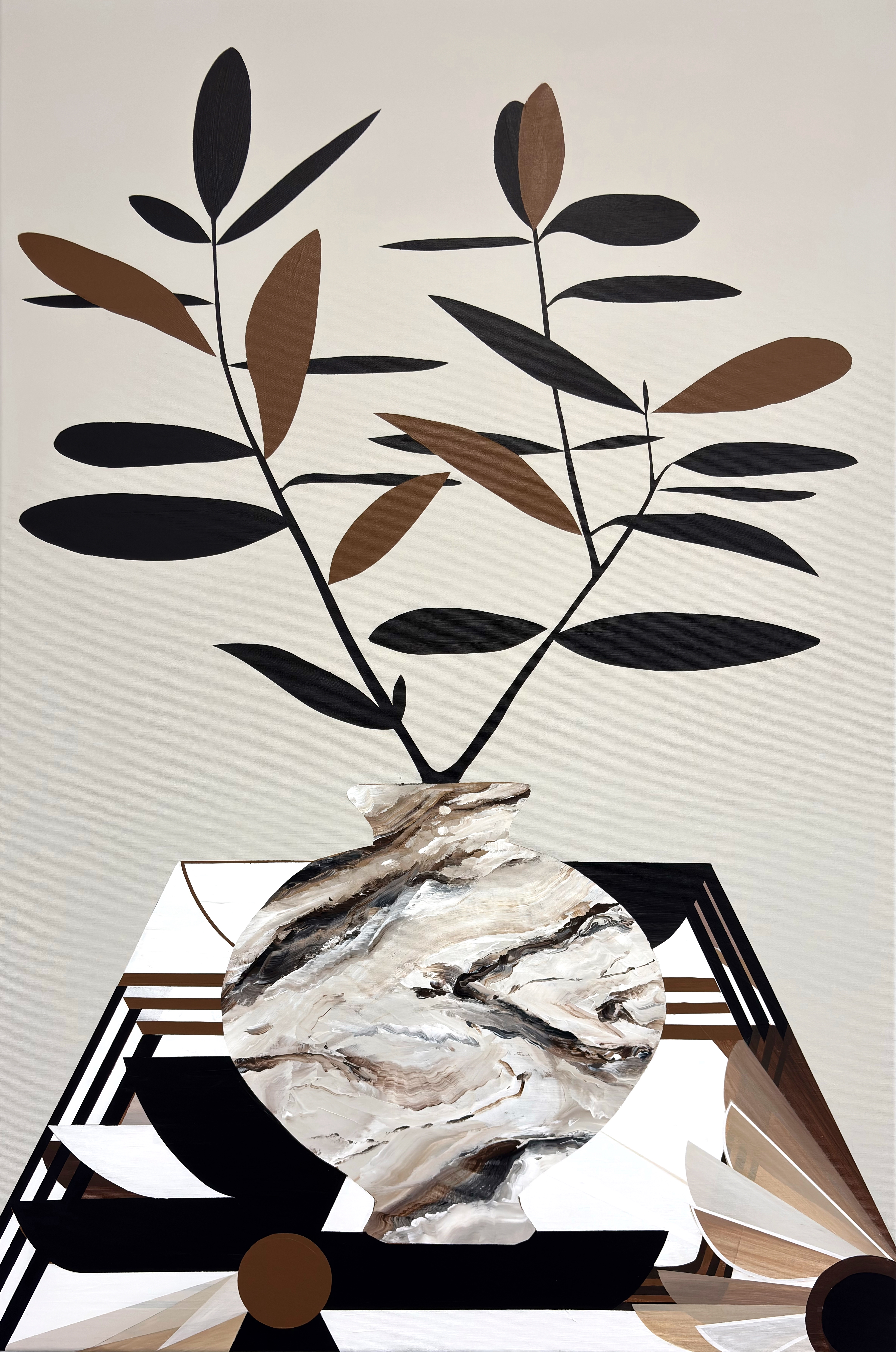 In Wish on Wings, a marble vase holds a poised olive branch, resting on a table patterned with refined Art Deco geometry. Delicate bird and wing shapes rest across the table. The lines are precise and layered in transparent and opaque paint in soft tones of white, beige, ochre, brown, and black, giving depth and rhythm to the surface. Subtle hints of light shimmer like the glow of a wish taking flight.