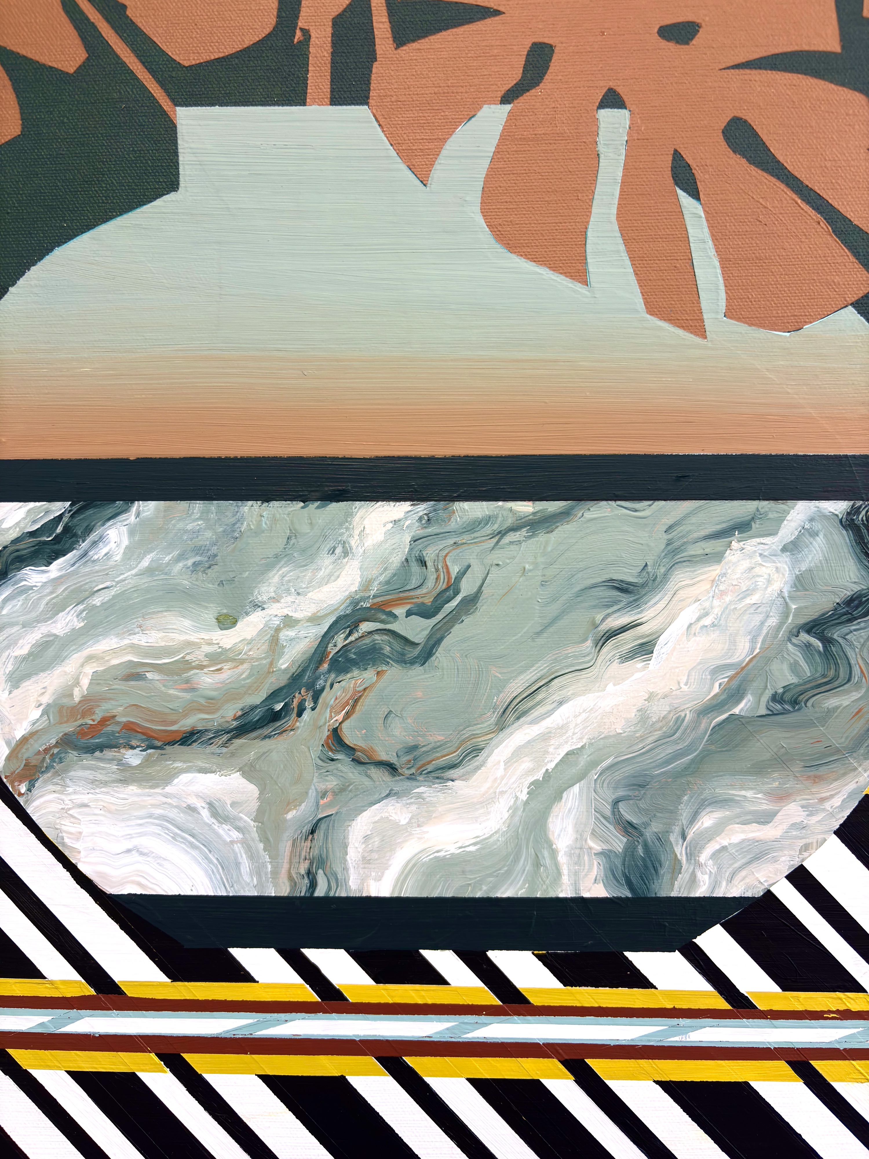 Each piece features a monumental, lush plant anchored in a unique pot – some natural, made of wood, marble, or glass; others adorned with bold graphic patterns that subtly nod to retro design and invite a longer gaze. The tables beneath the plants also play an essential role in the composition. Their intricate patterns and refined color transitions require technical precision and provide each painting with a dynamic foundation – rhythmic, layered, and always in dialogue with the plant above.