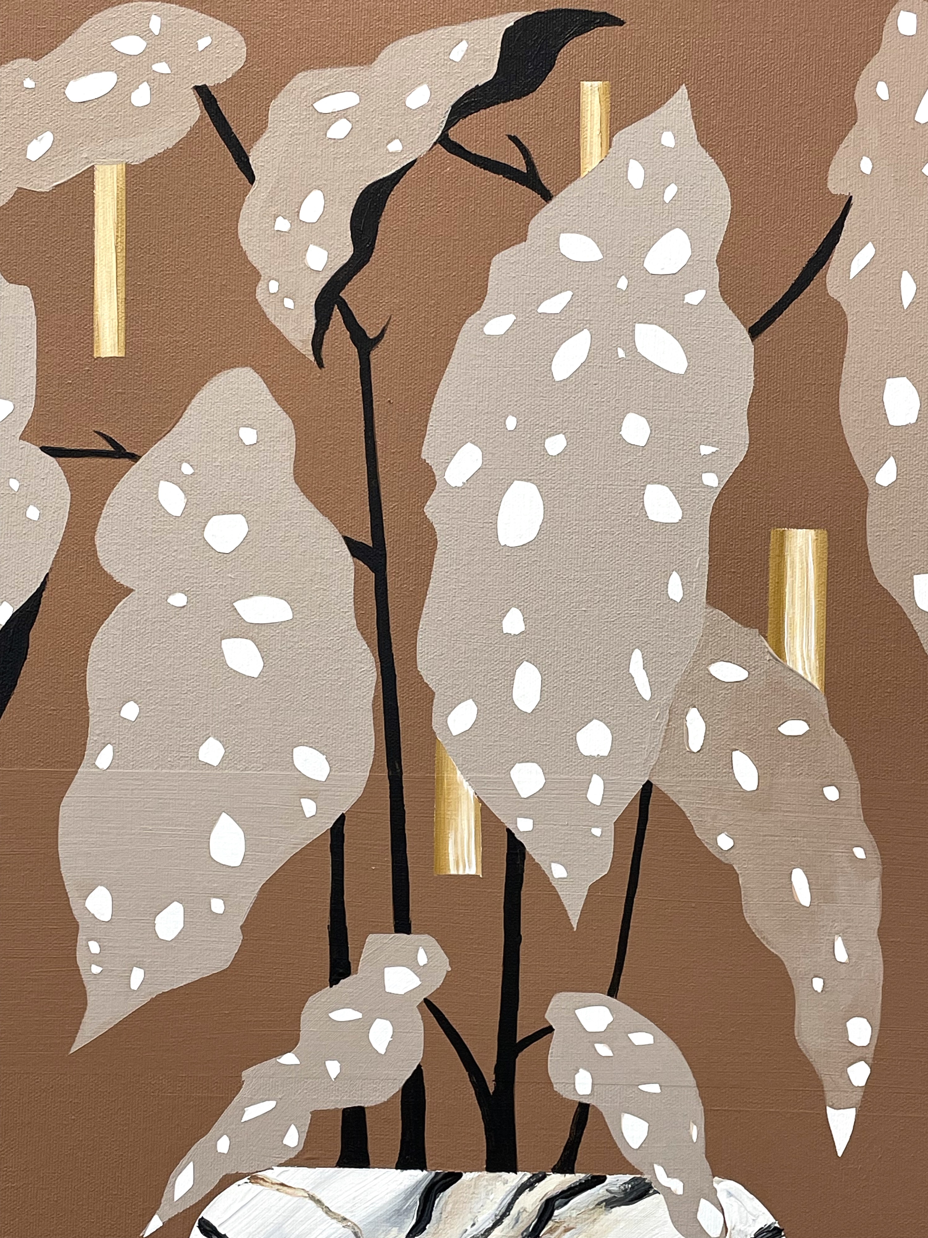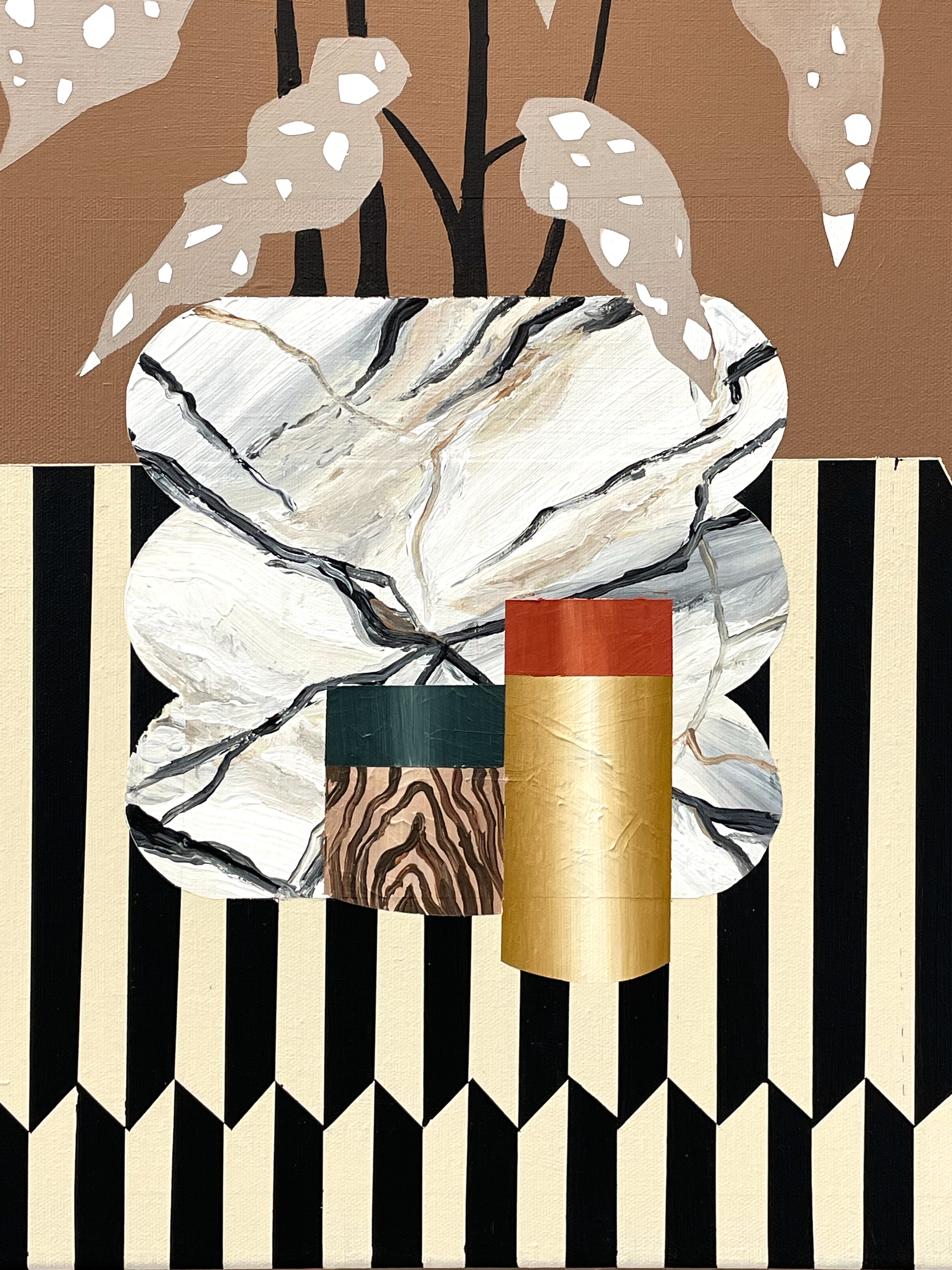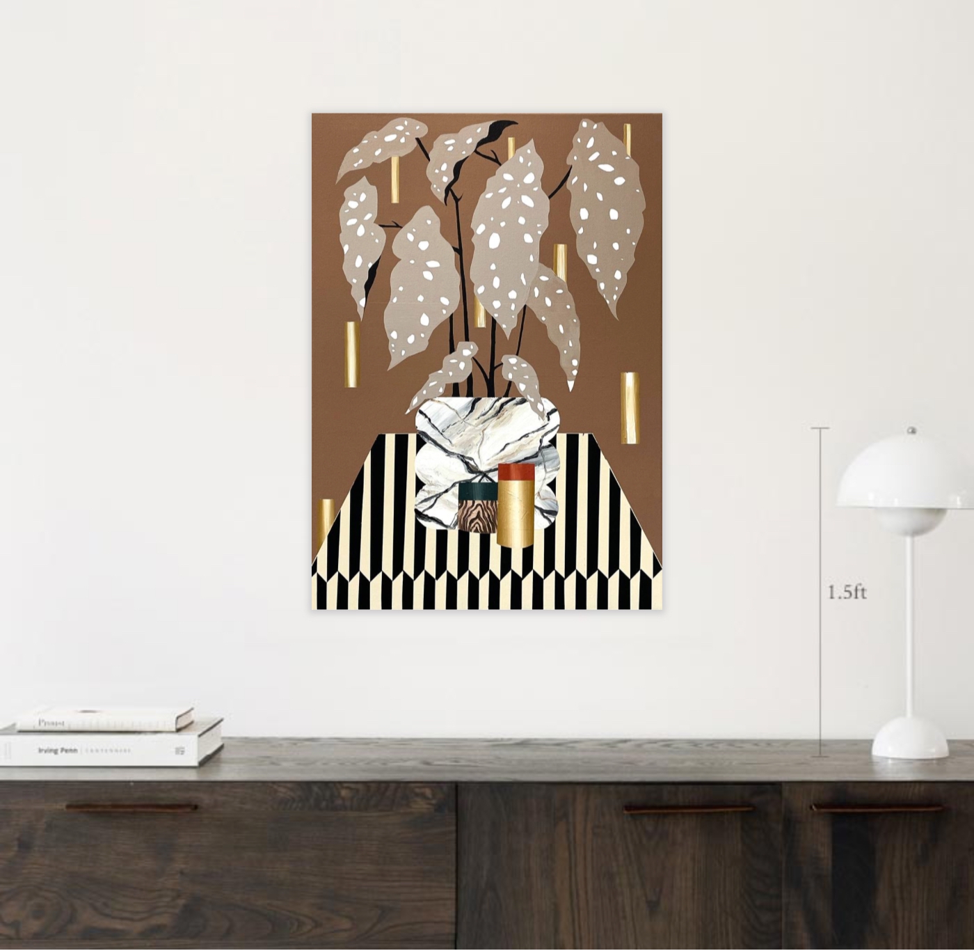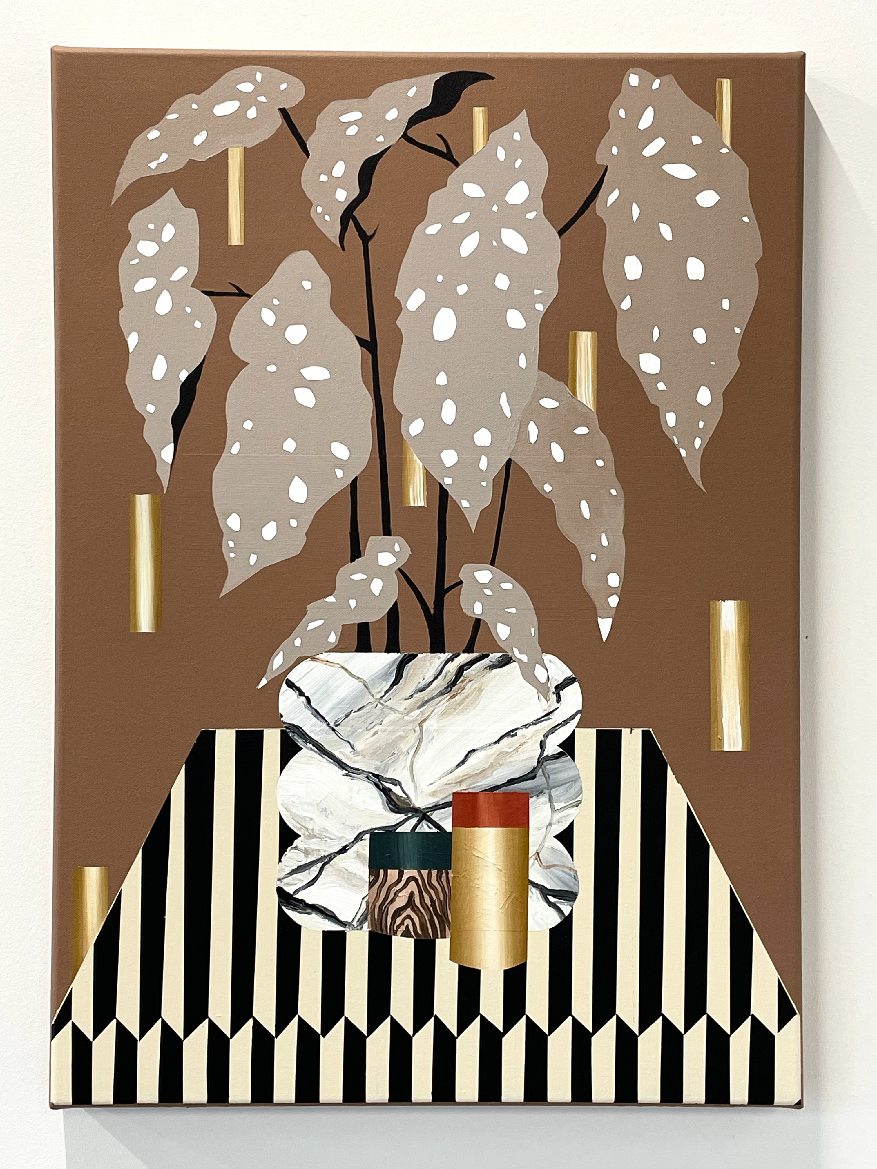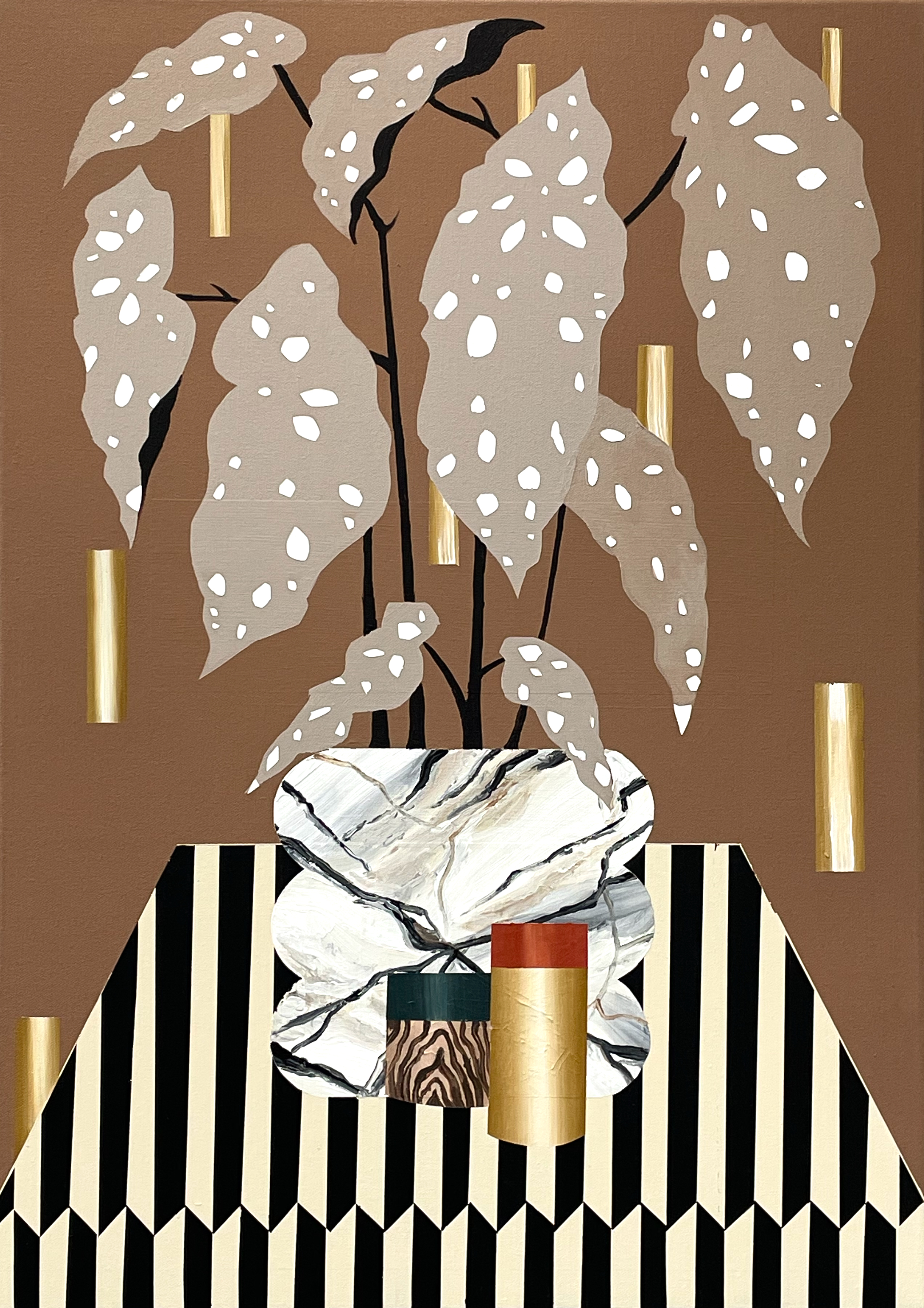 The geometric setting of the table and the playful dots of the plant enhance the contrasts between organic and structured forms. The title Golden Days symbolizes a period when someone or something is in full bloom or at its peak. Each golden element serves as a repository for cherished memories that the viewer can interpret personally.