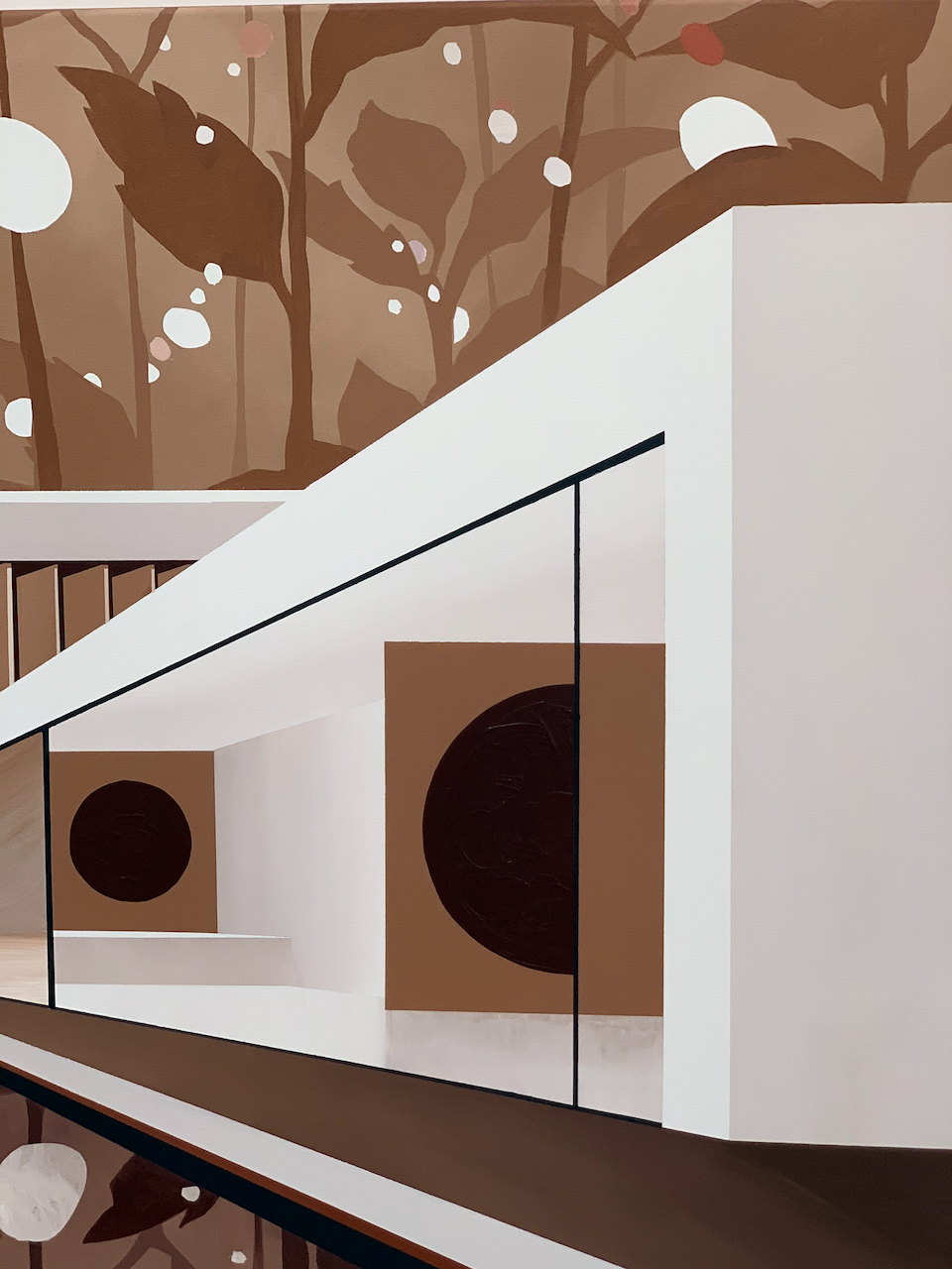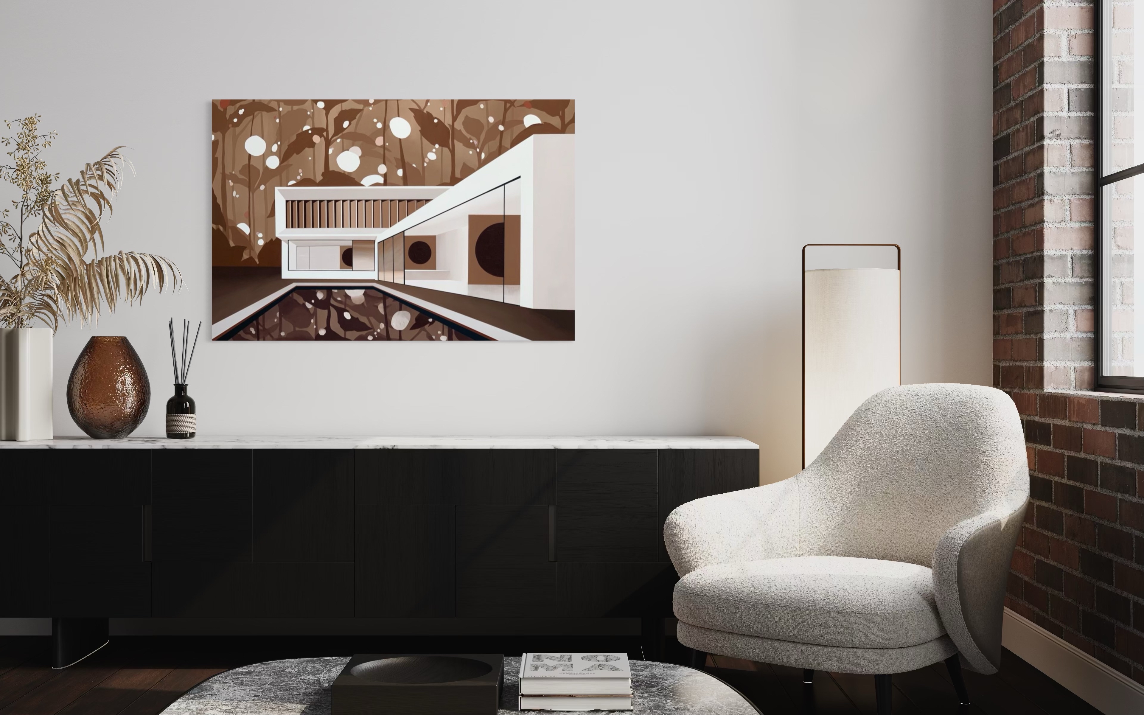The circle is regarded as a symbol of unity and wholeness. It also represents unconditionality and safety, as unity fosters a sense of trust. The color palette of warm browns, ochres, and whites adds a cozy, magical atmosphere to the scene, evoking a sense of wonder and tranquility. All is One invites viewers to escape into this enchanted evening, where architecture and nature coexist in perfect harmony.