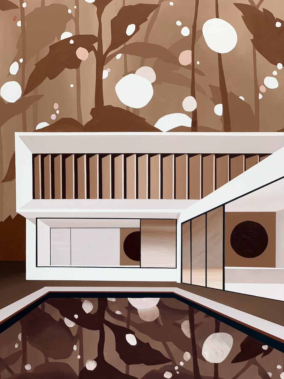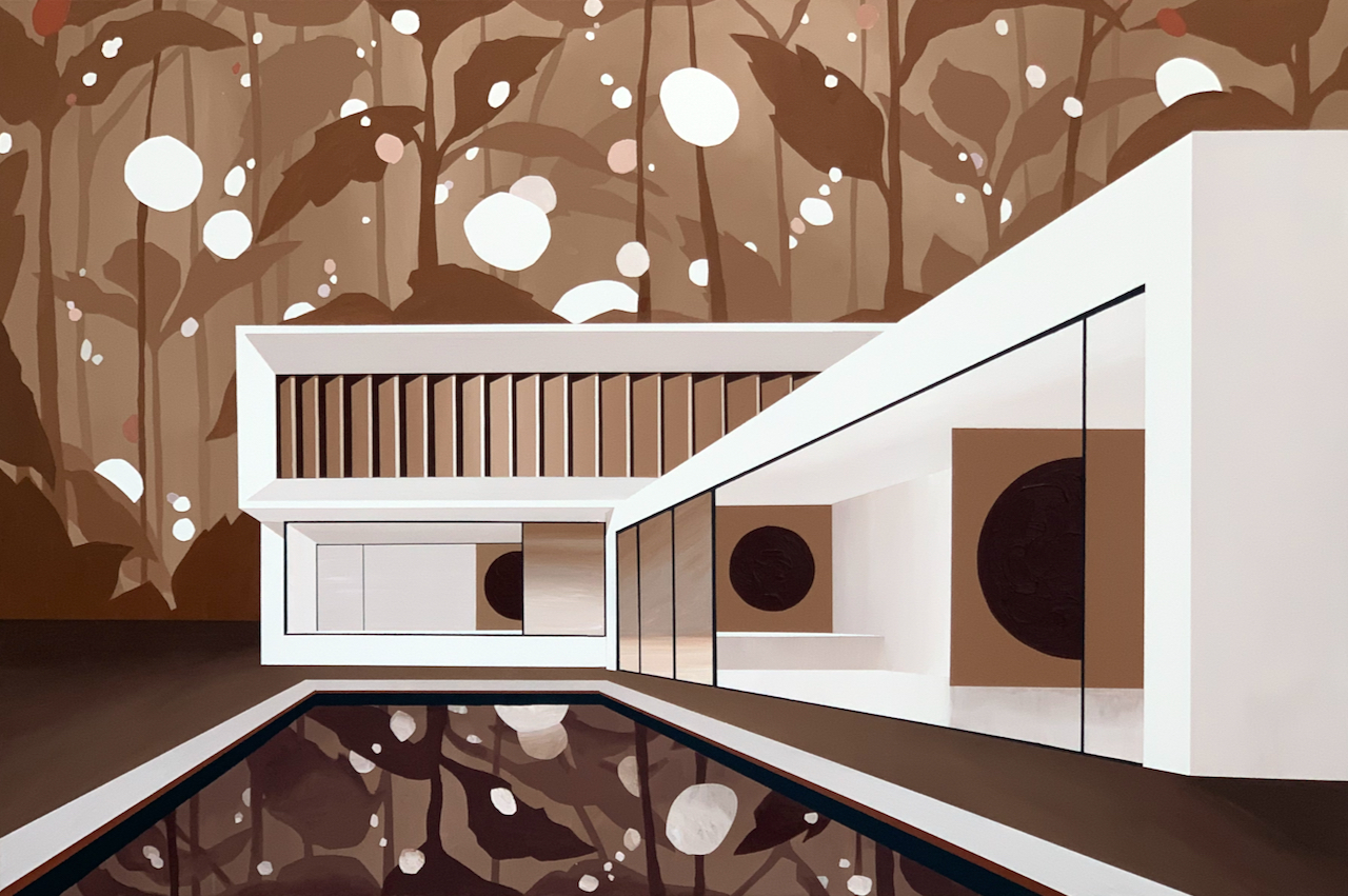 All is One features a pristine white mid-century pavilion, its clean lines and minimalist design standing in elegant contrast to the surrounding natural elements. Behind the building, oversized plants create a lush, dreamlike backdrop. Firefly lights float through the air, their gentle glow reflecting in the serene surface of the swimming pool below. The lights are like little beacons of hope, each light can hold a beautiful memory, shaped by the viewer.