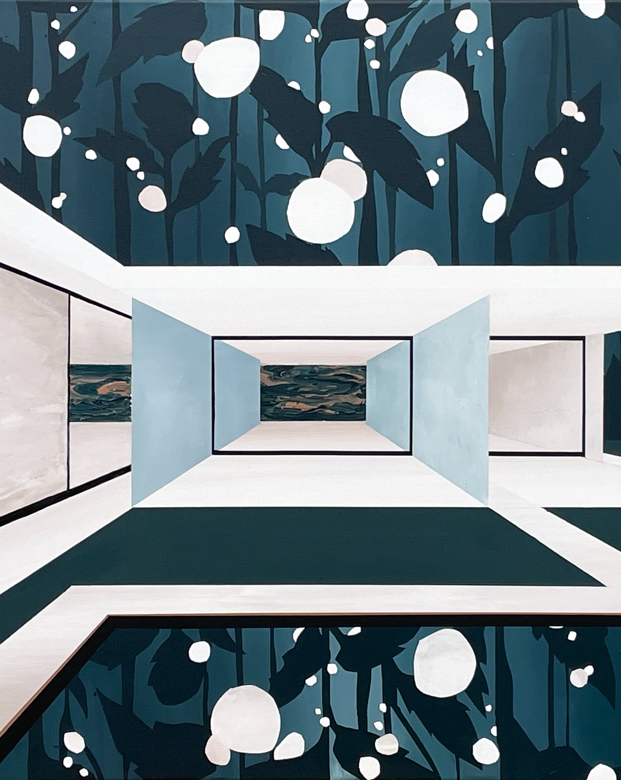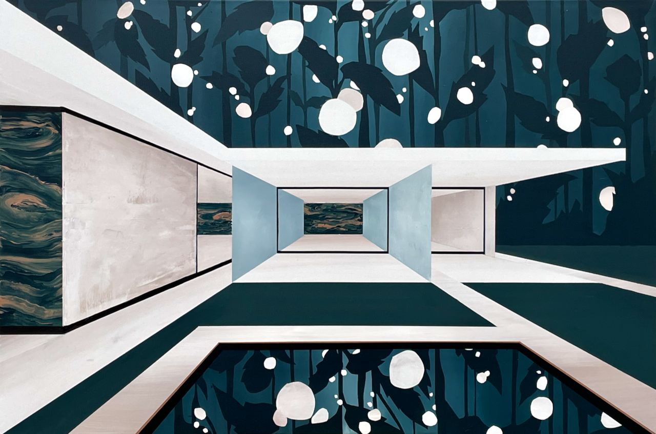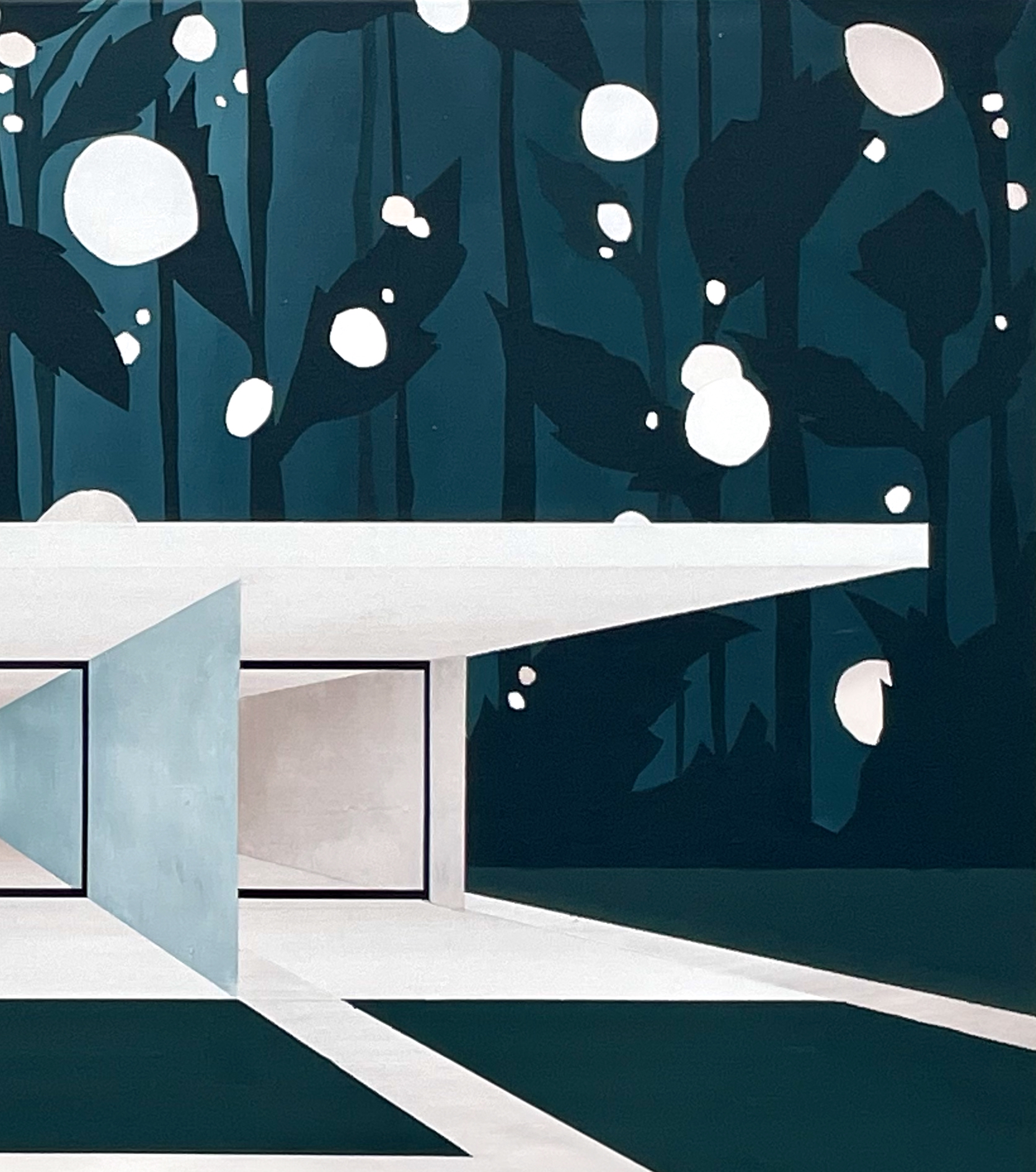 Nocturne depicts a modern white villa with marble elements, presented in a striking perspective. Among the magnified plants in the background, fireflies float gently. Their lights symbolize beacons of hope, each containing a cherished memory that the viewer can interpret personally. The artwork is rendered in shades of blue, with the lush nature reflected in the villa’s pond, all illuminated by the soft glow of evening light.