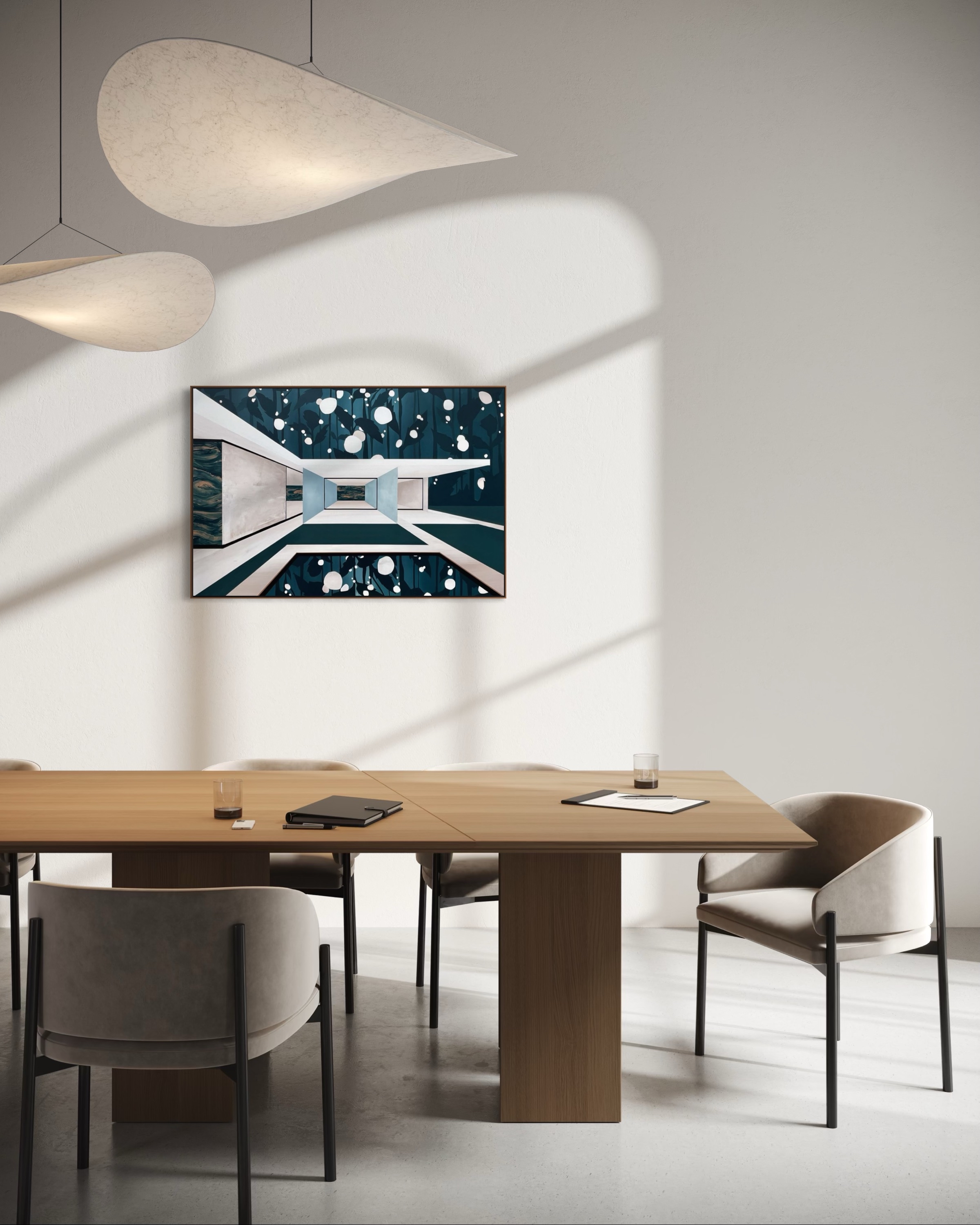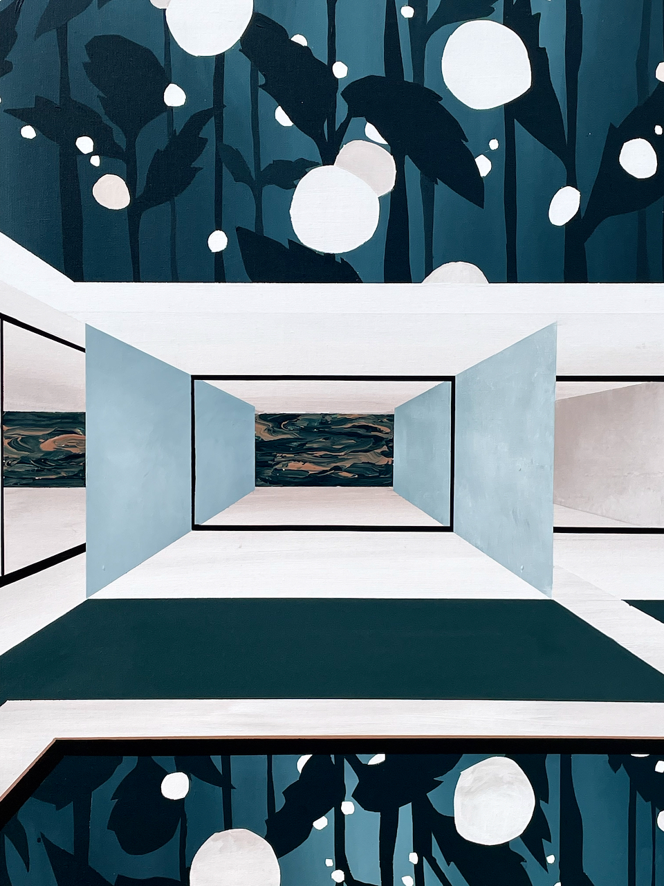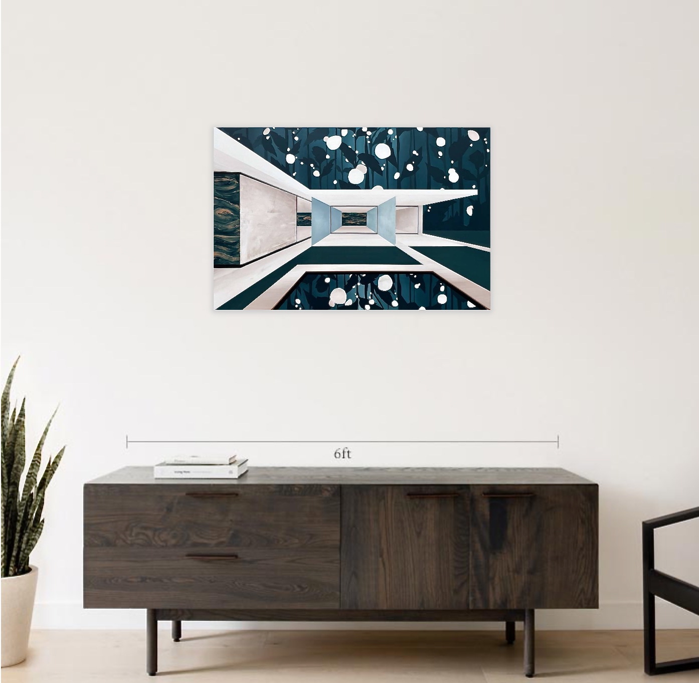 Nocturne depicts a modern white villa with marble elements, presented in a striking perspective. Among the magnified plants in the background, fireflies float gently. Their lights symbolize beacons of hope, each containing a cherished memory that the viewer can interpret personally. The artwork is rendered in shades of blue, with the lush nature reflected in the villa’s pond, all illuminated by the soft glow of evening light.