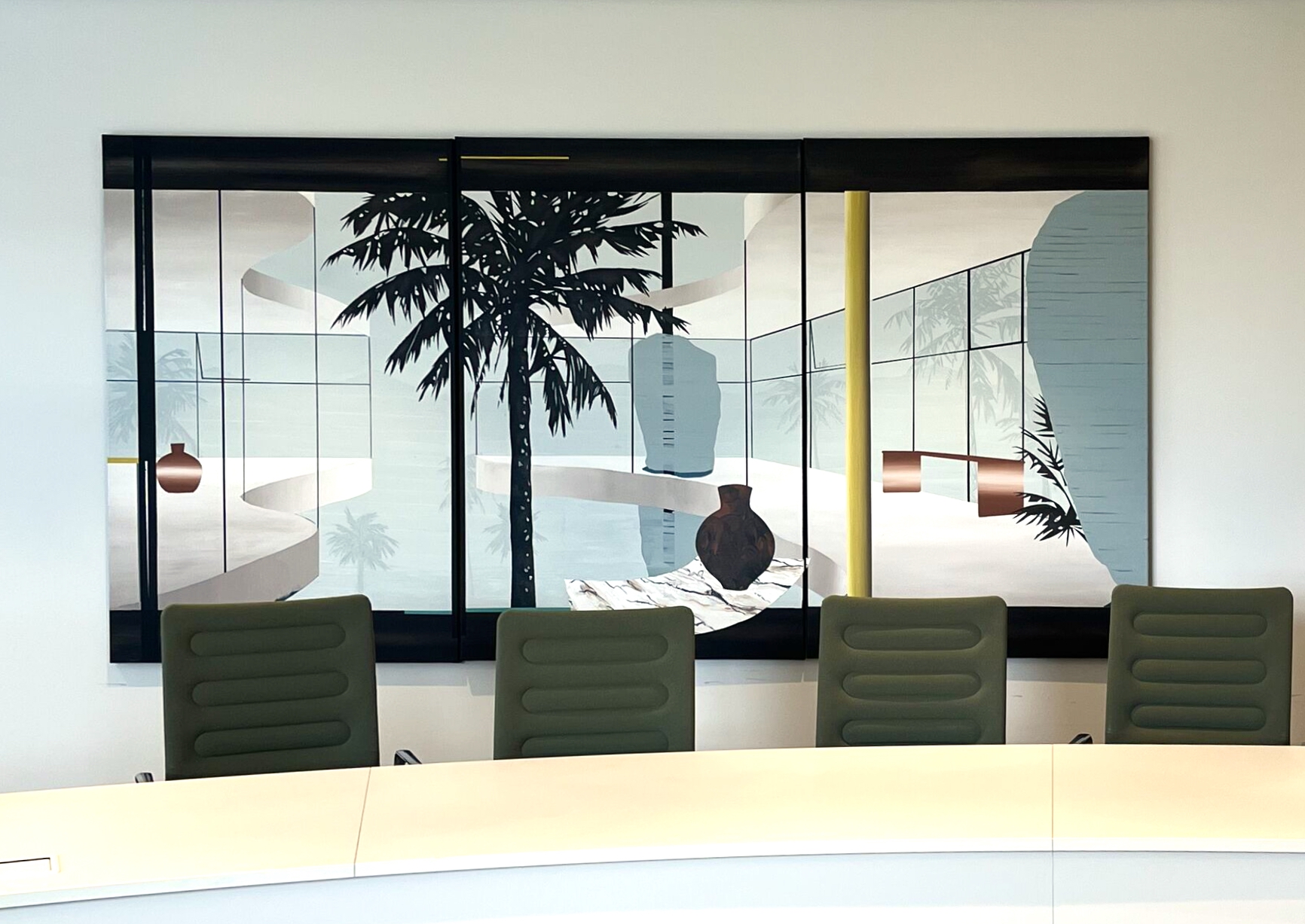 I'm proud to share that this statement piece has found a beautiful spot in the boardroom of this accounting firm in Amsterdam. 'Floating Oasis' measures 150x300 cm and brings a natural and serene atmosphere to the space.