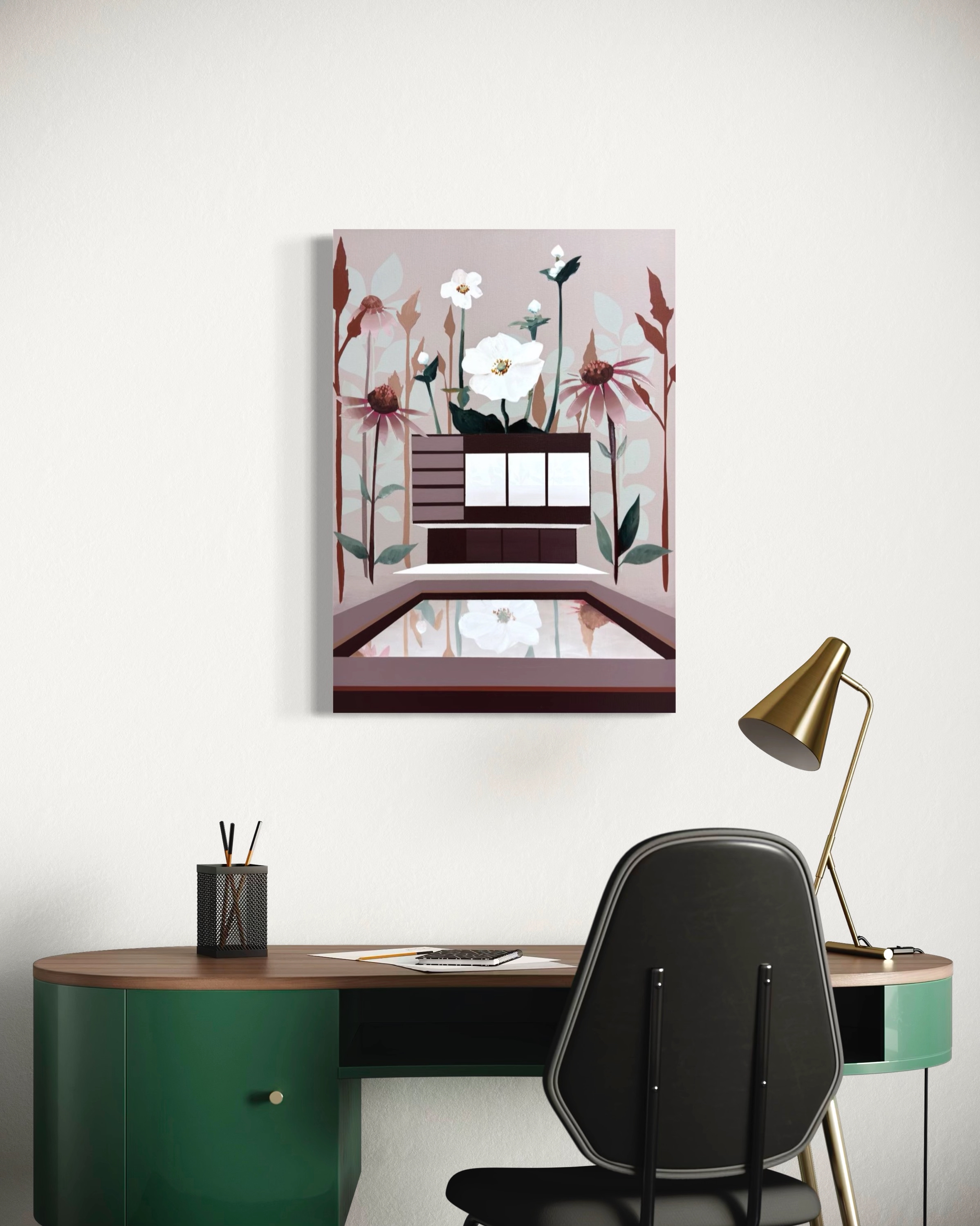 The atmosphere is imbued with a autumn glow, enhanced by the glossy lacquer that highlights select flowers, plants, and the water's surface. Autumn Elegance invites viewers into a tranquil moment where the sophistication of modern design harmonizes with the vibrant hues of nature's autumn palette.