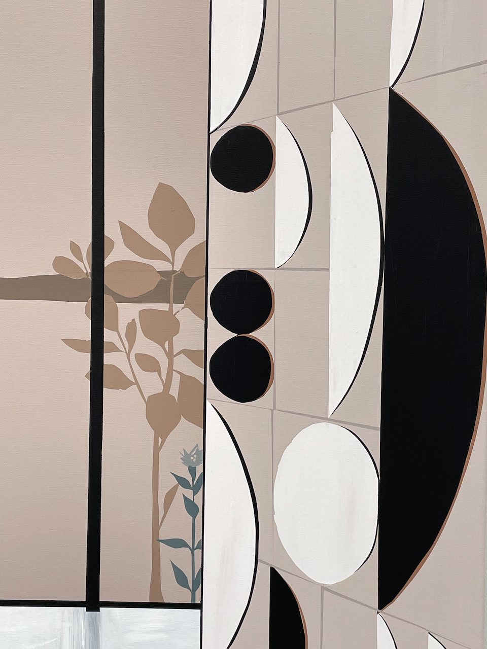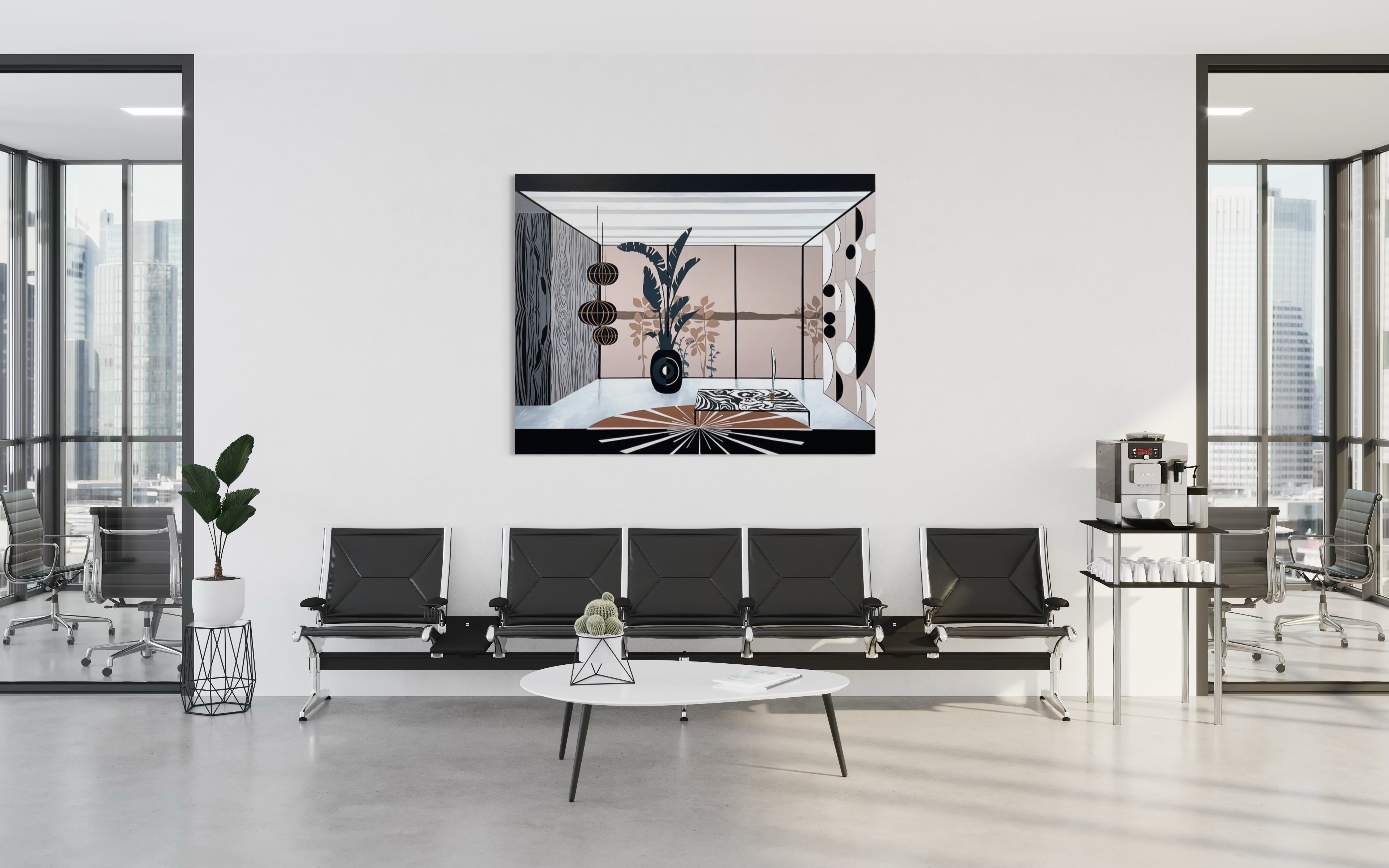 The color palette features taupe, light brown, gray-blue, black, and white, creating a tranquil and contemplative ambiance. Daydreamer invites viewers to indulge in a moment of reverie, where the fusion of natural beauty and modernist interior design fosters a sense of calm introspection and imaginative escape.