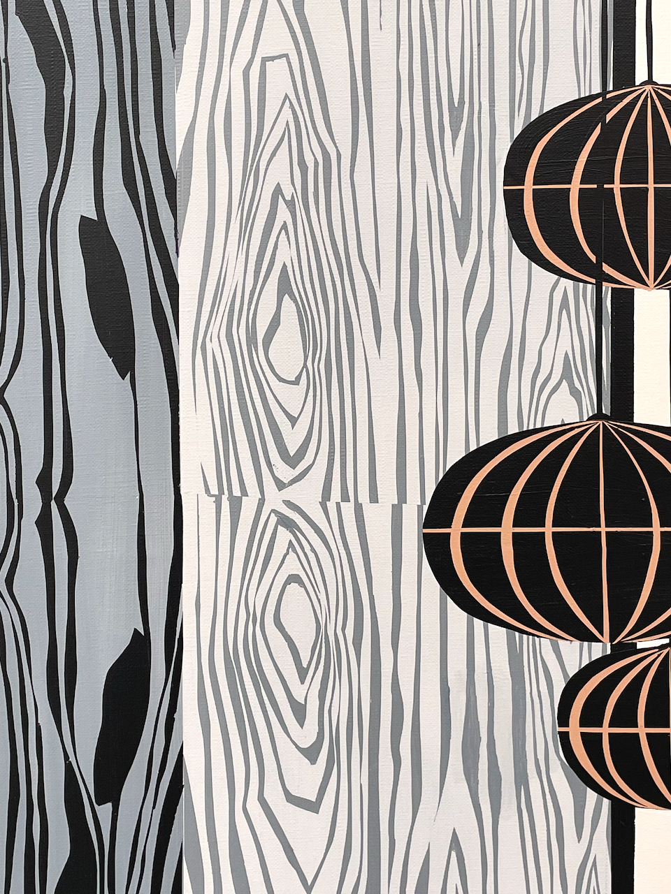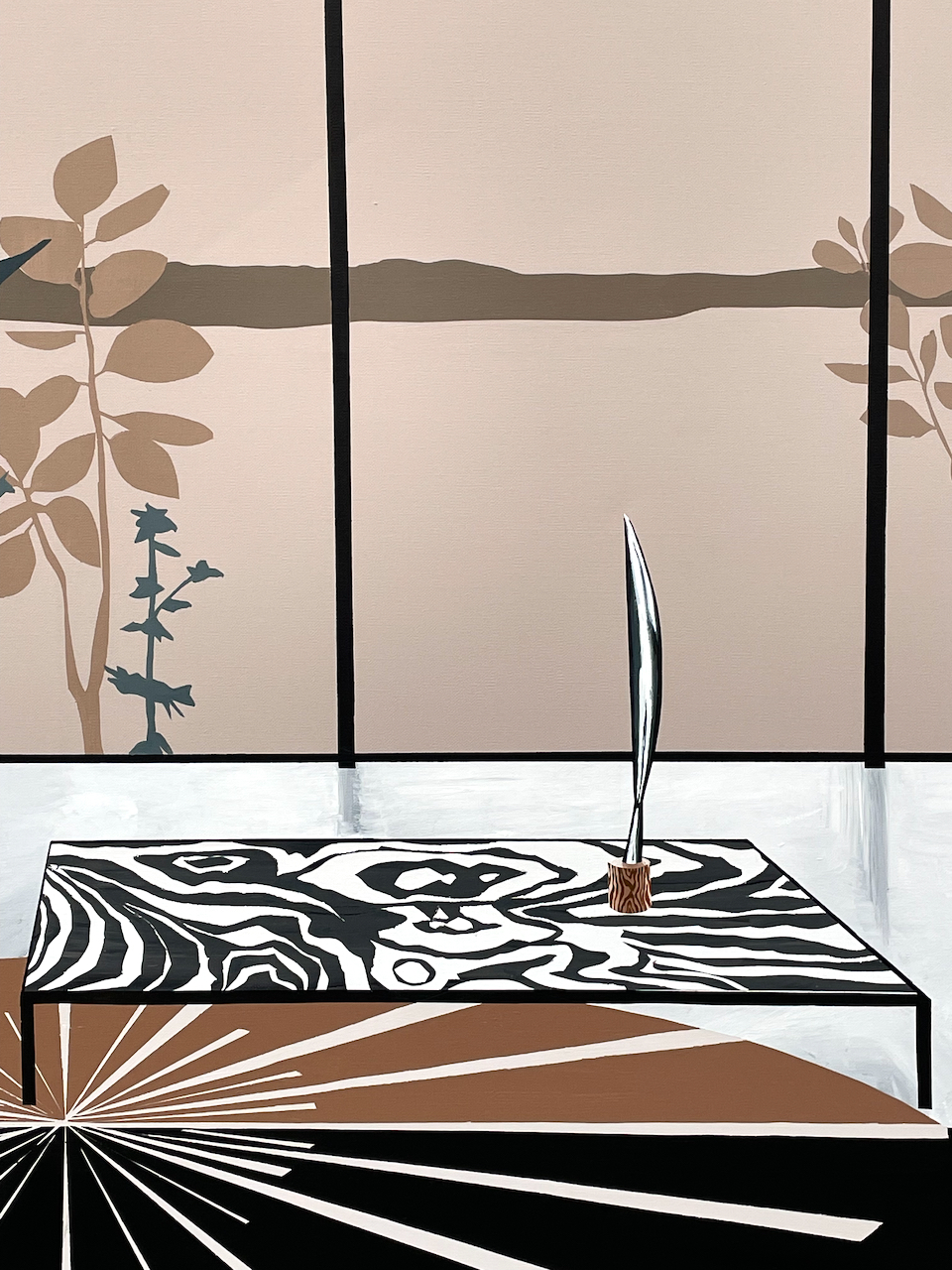Daydreamer captures the interior of a mid-century villa, offering a panoramic view of the sea. The space is adorned with natural design elements like a wood veneer wall and a marble table with Brancusi's "Bird in Space" sculpture. The title reflects the dreamy atmosphere of the painting, portrayed through sun and moon motifs on the right wall and within the rug.