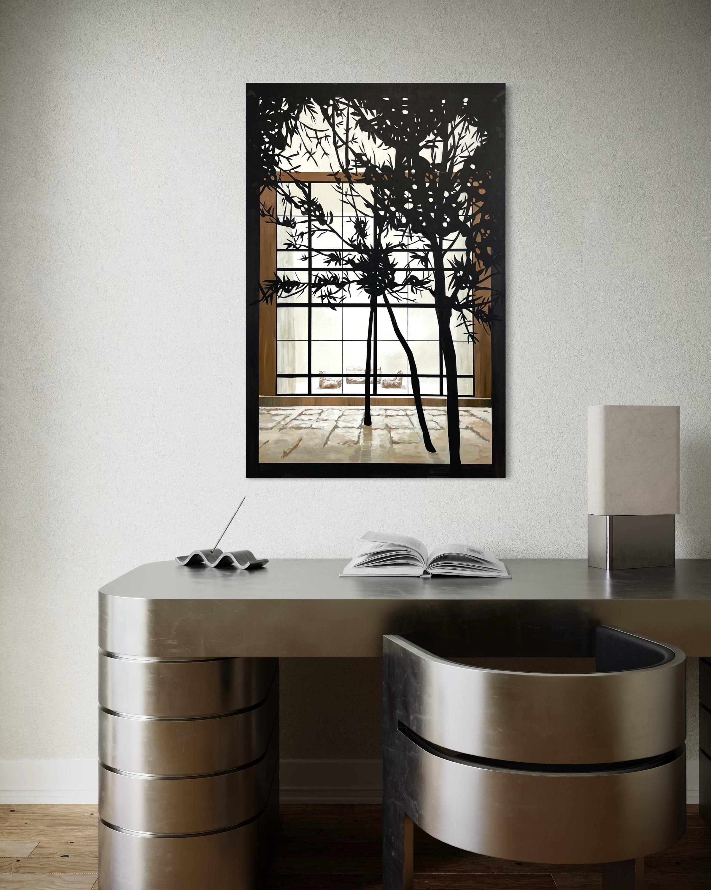 Evening light bathes the scene in a soft, tranquil glow. Silhouetted trees, full of leaves, stand gracefully before a modern window that reveals a subtle retro interior. In tones of black, beige, and light brown, the composition feels poetic and serene: a quiet moment suspended between nature and architecture.