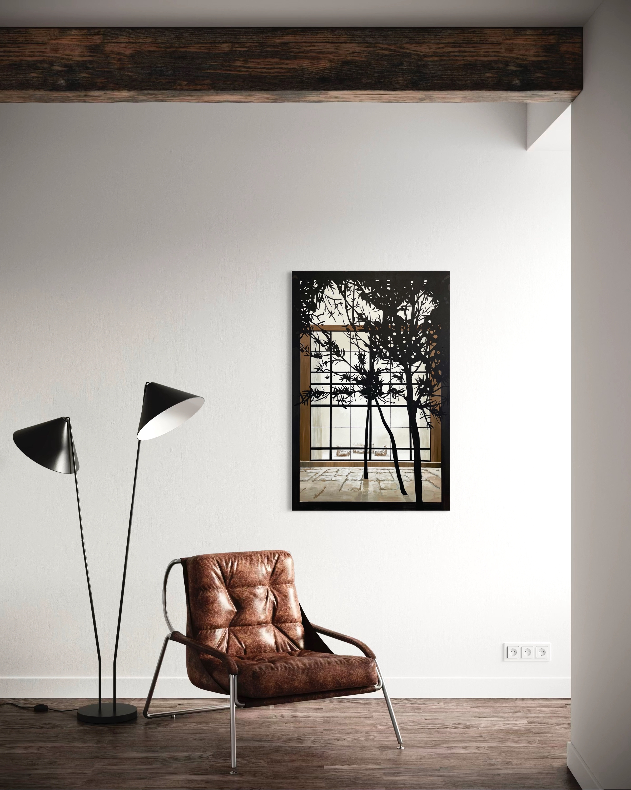 Evening light bathes the scene in a soft, tranquil glow. Silhouetted trees, full of leaves, stand gracefully before a modern window that reveals a subtle retro interior. In tones of black, beige, and light brown, the composition feels poetic and serene: a quiet moment suspended between nature and architecture.