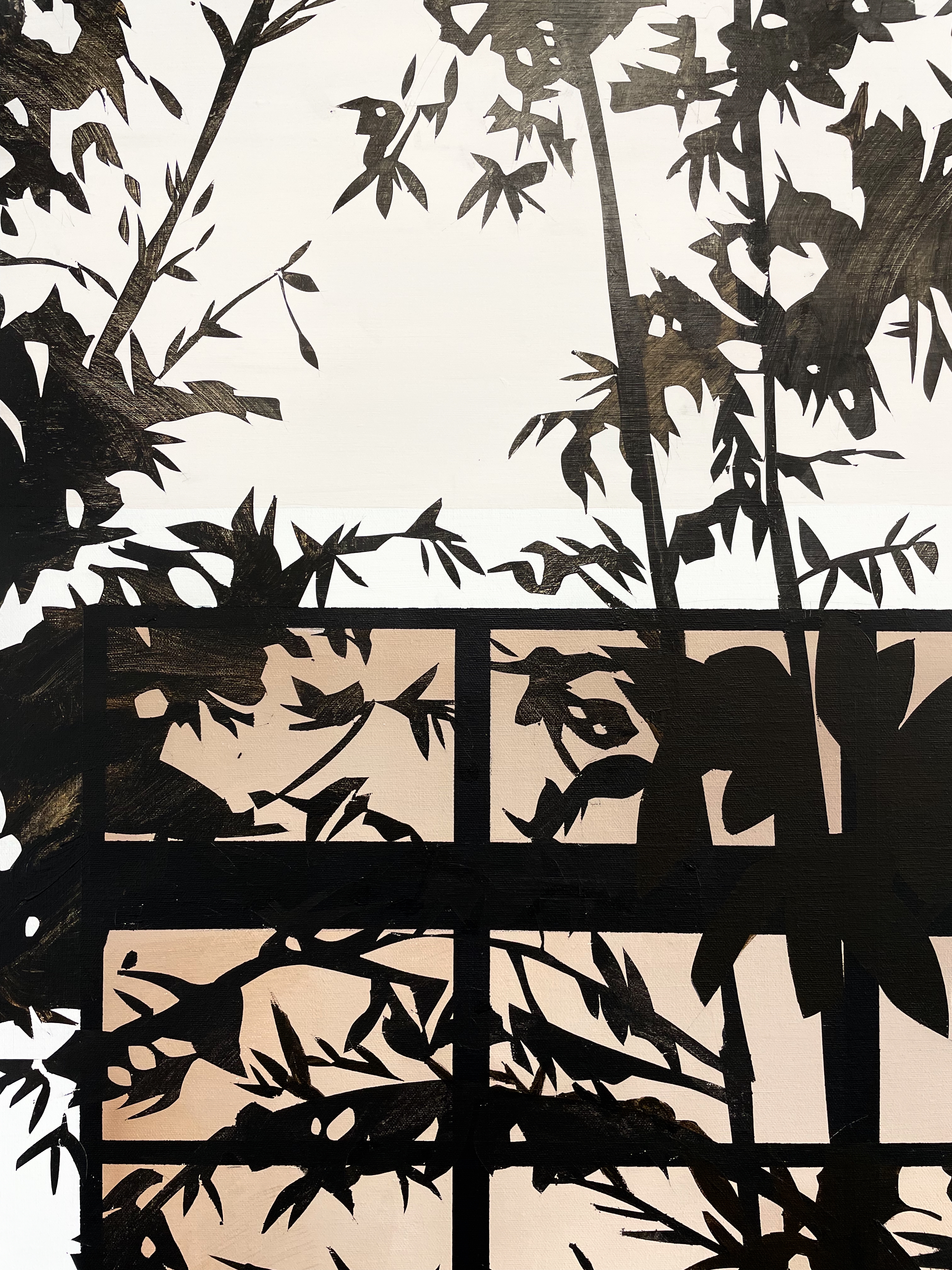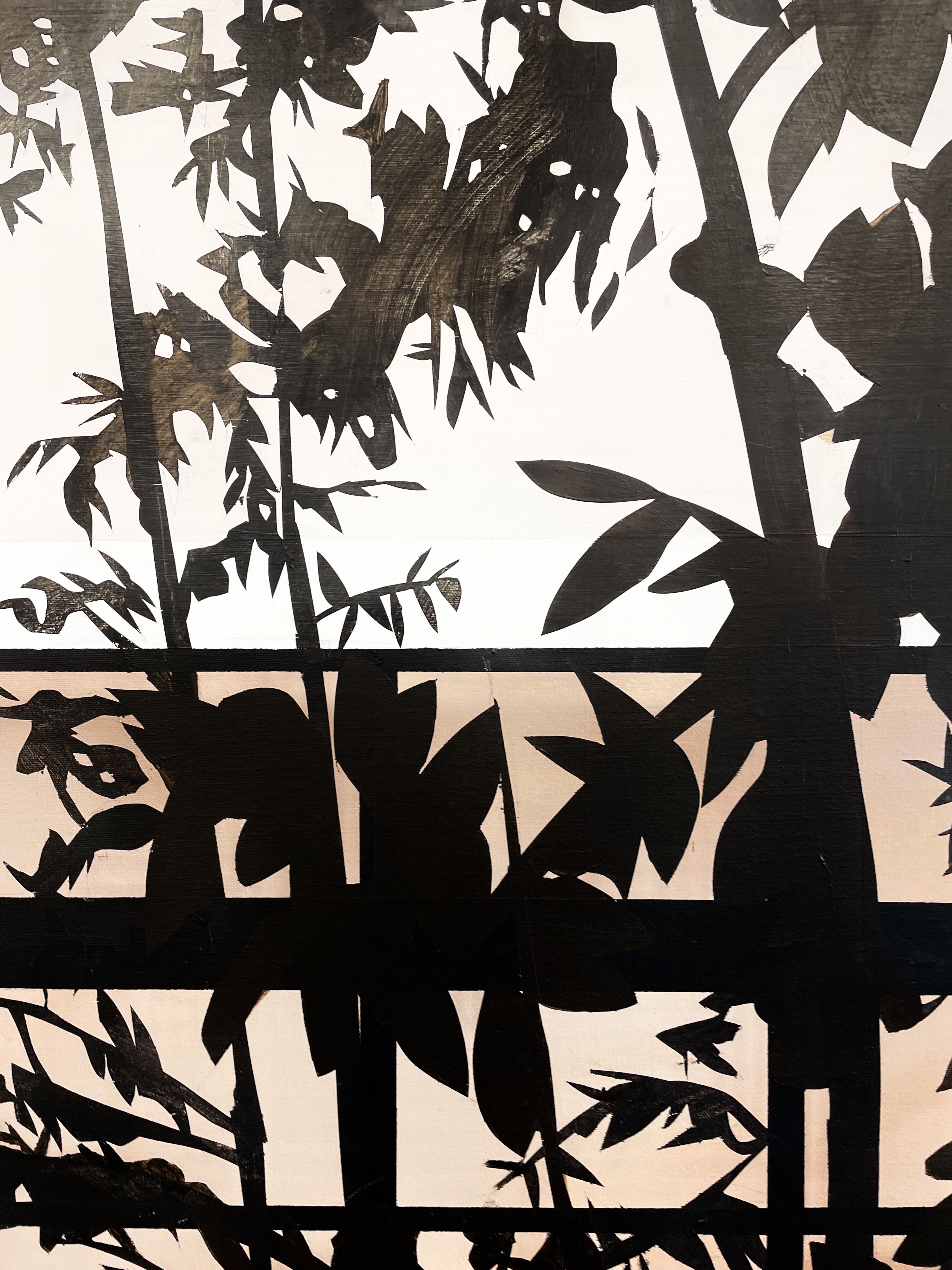 The tree’s foliage is rendered in graphic shapes, using deep browns and blacks. Some leaves are painted opaquely, while others appear thin and translucent. This variation creates a rhythmic interplay of density and openness, giving the canopy a sense of movement within stillness.