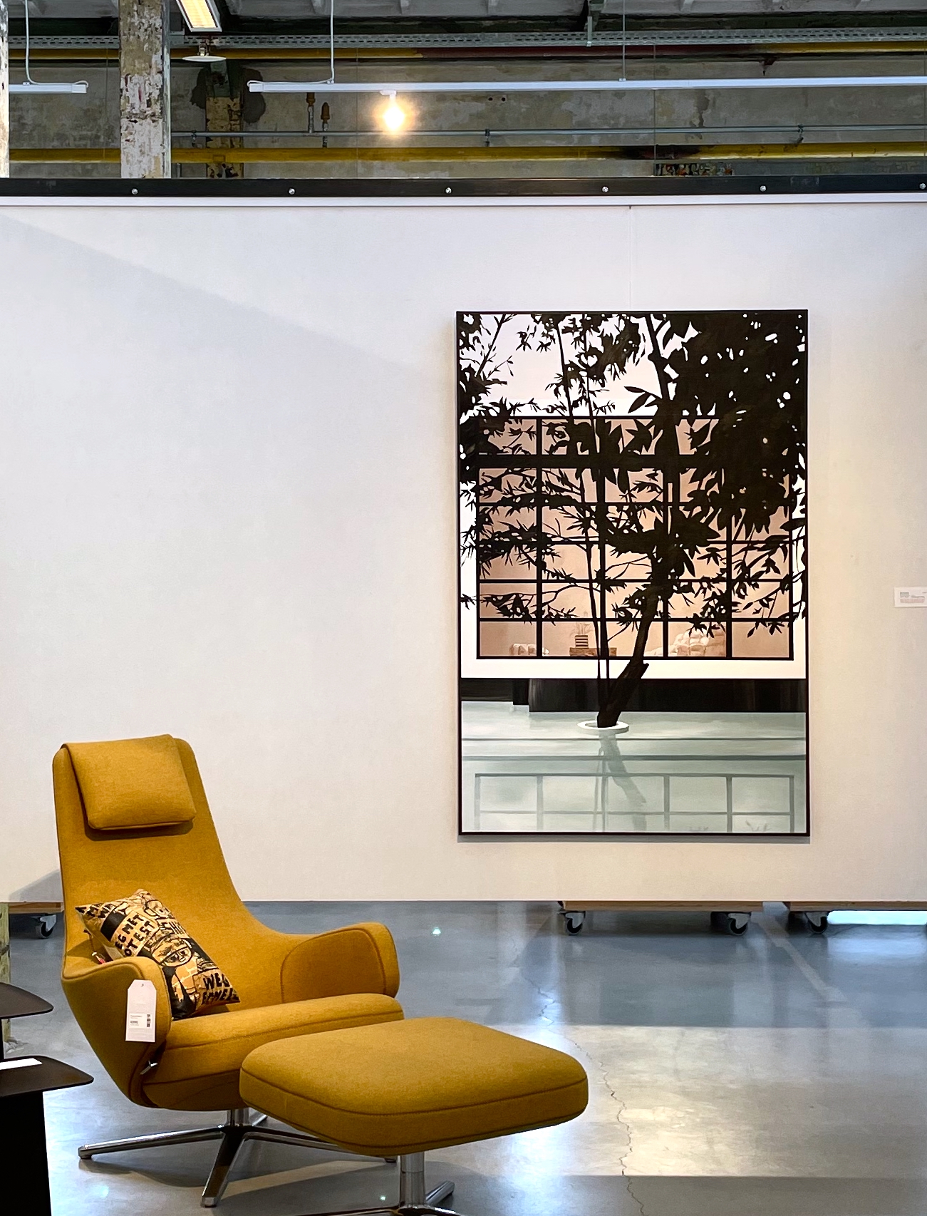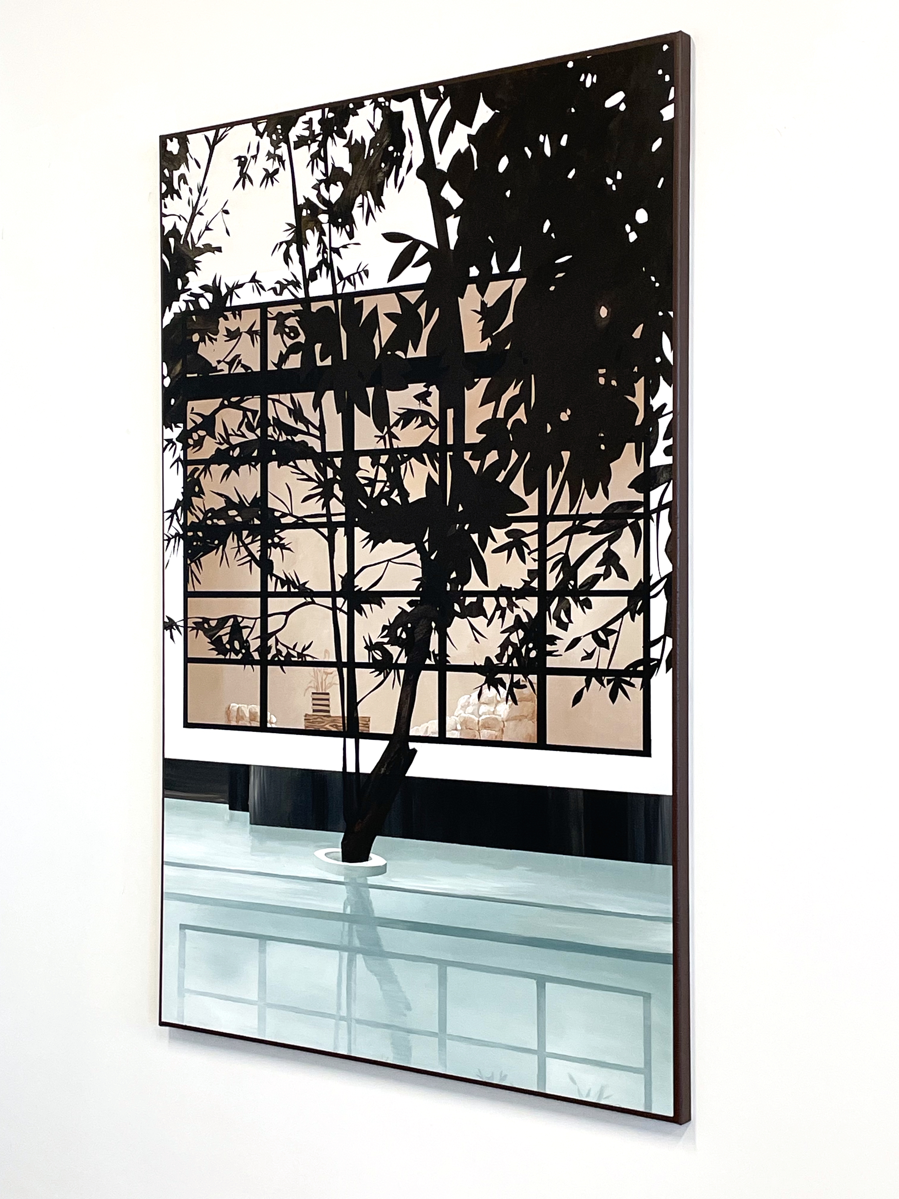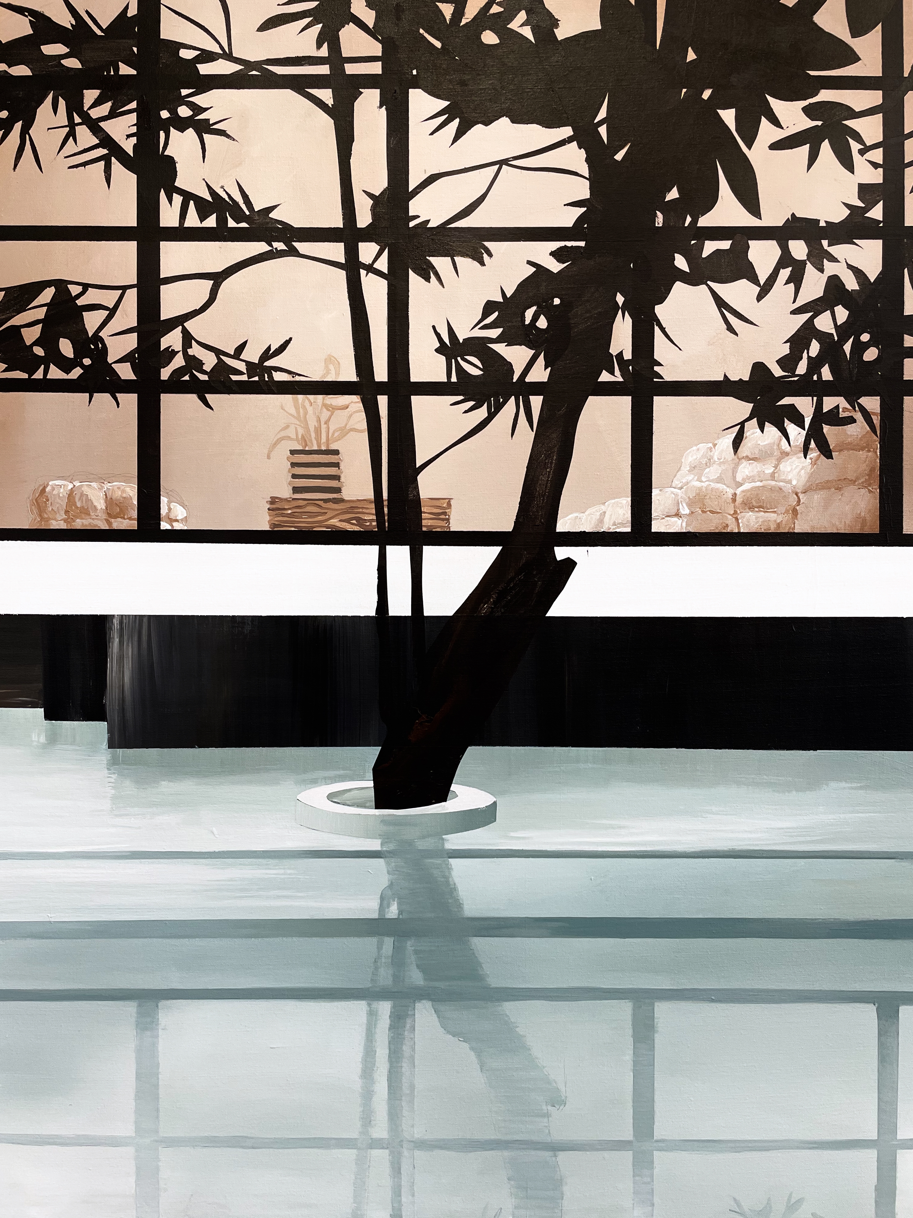 In the water below, reflections blur the outlines of the tree and the window. Lines soften, colors dissolve — light brown, black and white, with touches of mint green. The scene radiates calm. Still Presence captures a moment where everything aligns: nature, reflection, architecture, and atmosphere. A vision of quiet luxury and timeless presence.