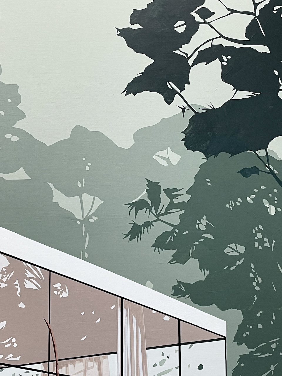 The color palette features shades of white, bottle green, dark green, and taupe, echoing the natural beauty of the landscape. The Trees are filled with Memories evokes a sense of nostalgia and tranquility, inviting viewers to experience the enchanting interplay of light and nature, where the beauty of the outdoors dances with the modern elegance of architectural design.