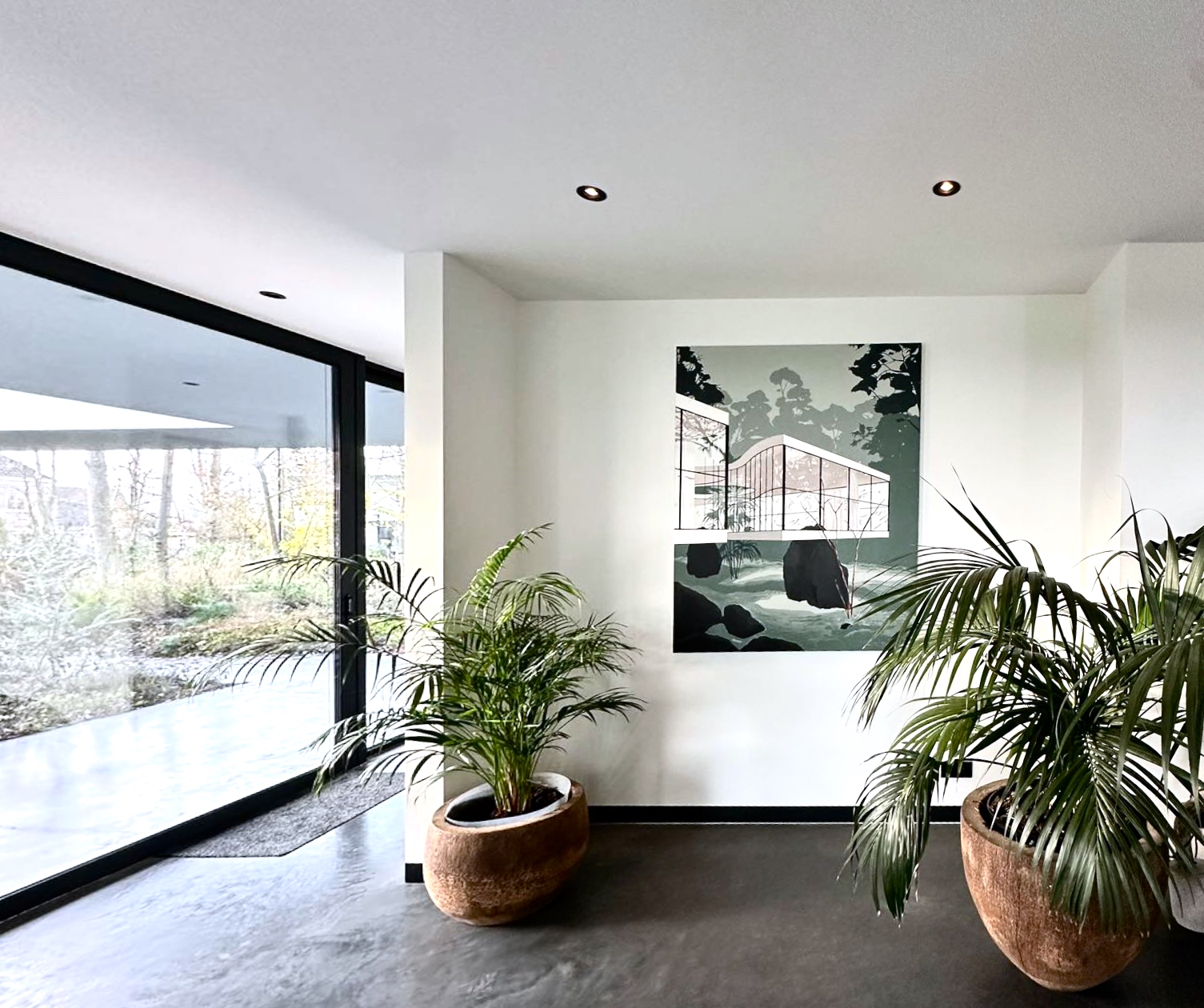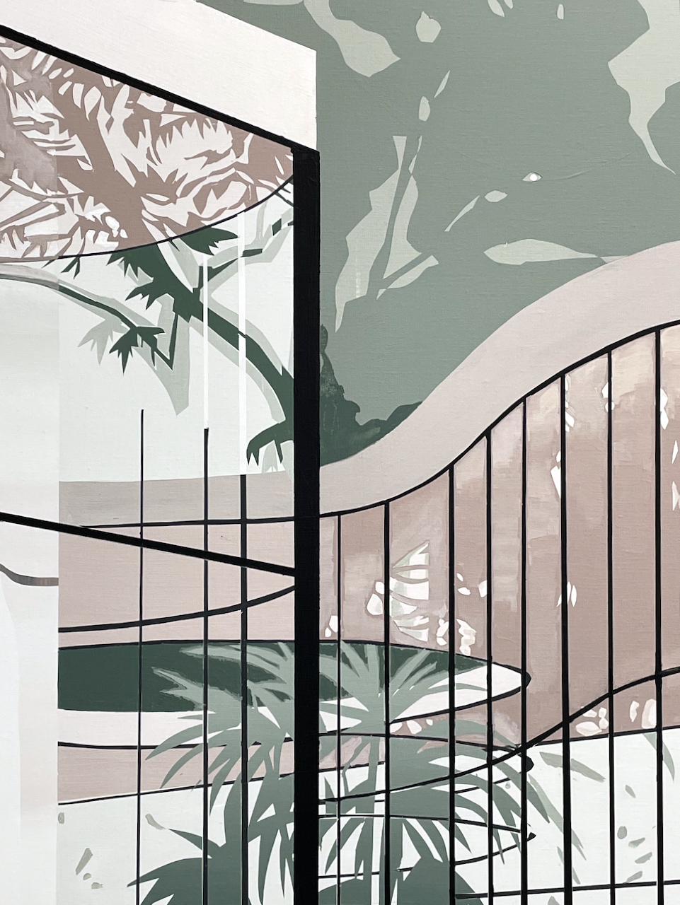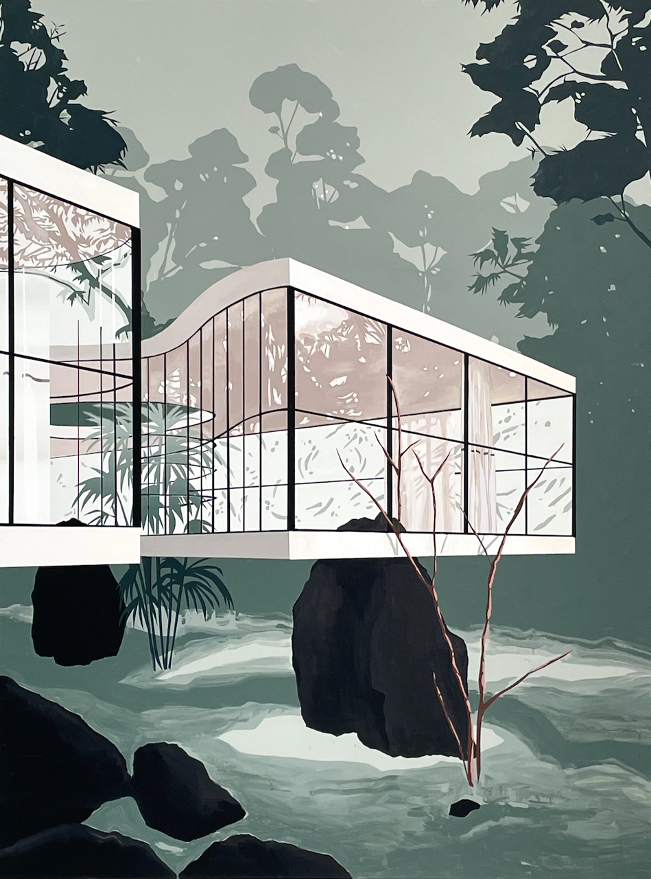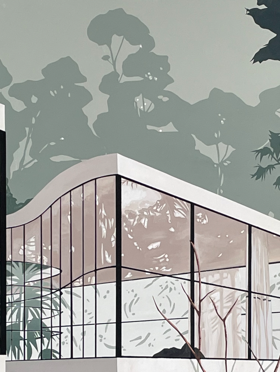 This painting captures the essence of Casa Atibaia, a dreamy, ethereal villa born from the collaboration of designers Charlotte Taylor and Nicholas Préaud. The villa, a testament to Brazilian modernism, stands as a white modern house entirely made of glass. It is enveloped by lush vegetation, celebrating and honoring its surroundings. The villa's windows reflect the surrounding trees, creating a whimsical and dynamic visual effect.