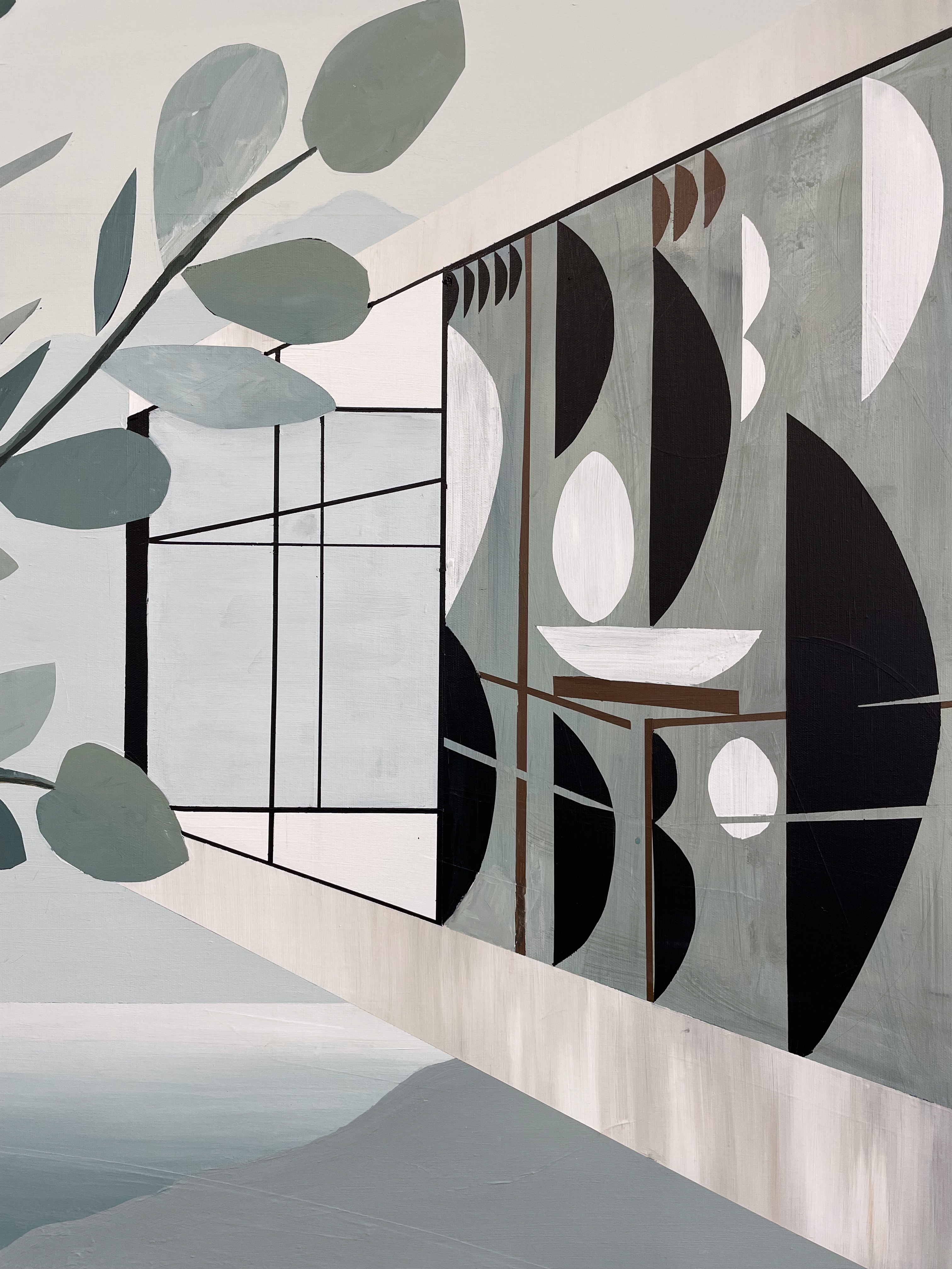 At the center of this work stands the Tree of Wisdom, symbolising intuition, balance and inner calm. On the right, a villa perched on a mountain overlooks the sea, offering a sense of clarity and spaciousness. Circular patterns represent the sun (white) and the moon (the black half circles), reflecting the natural rhythm of life. The harmonious palette of blue, sea green, white and black enhances the serene and timeless atmosphere, making this piece a captivating focal point for any space.