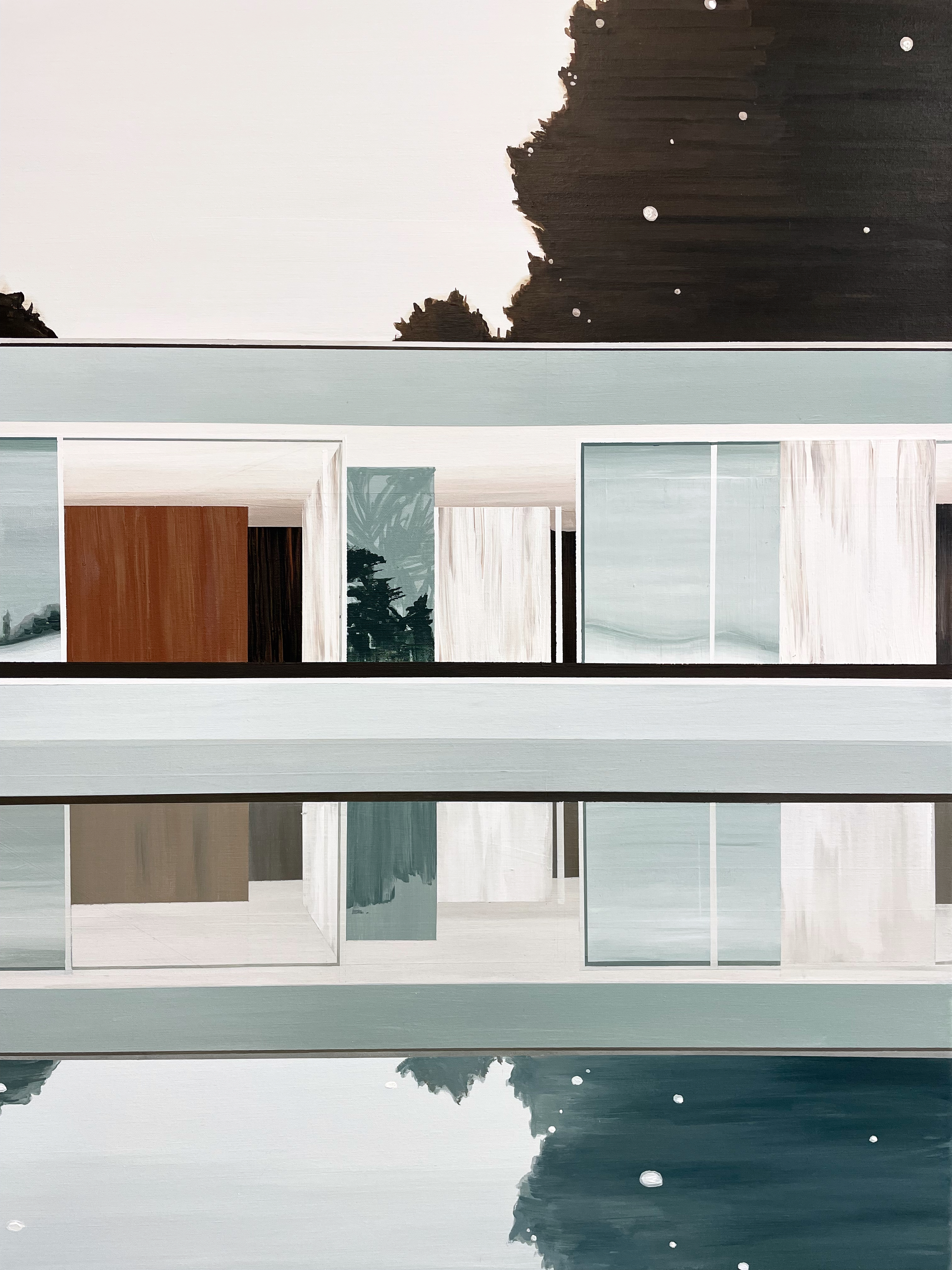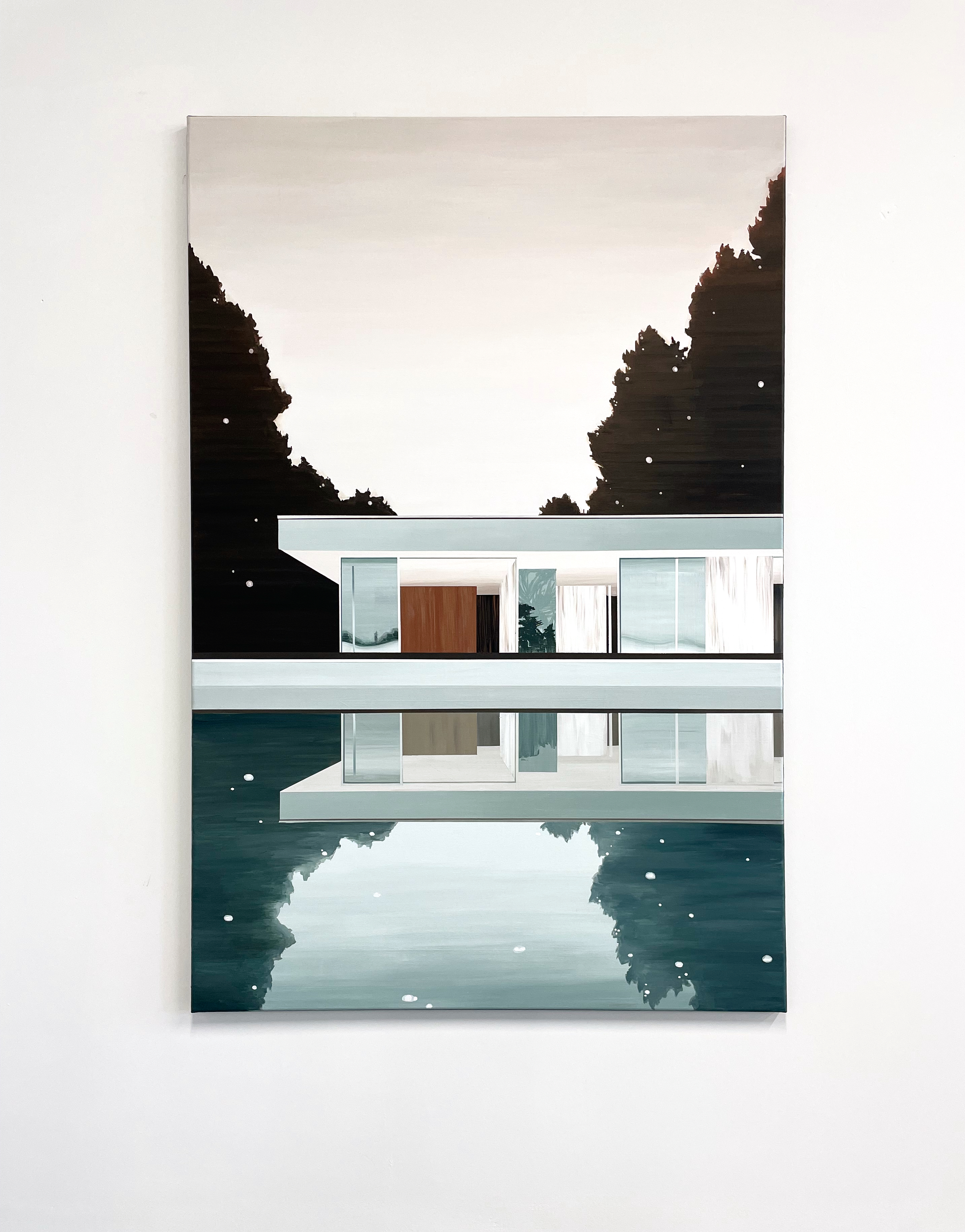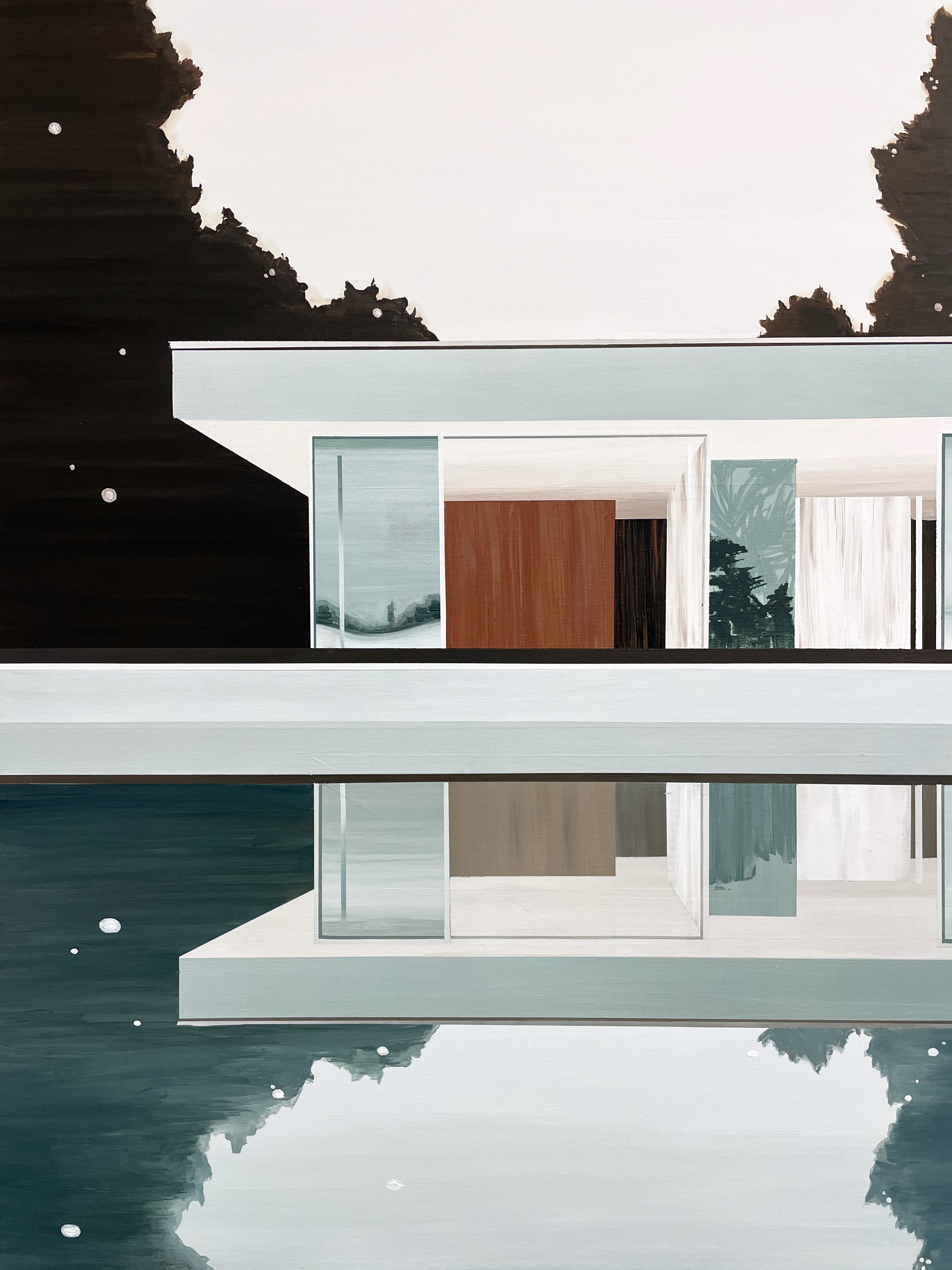 Behind the villa, lush trees form a verdant backdrop, their subtle lights dancing in the pond's surface, enhancing the atmosphere of quiet enchantment. The earthy tones of beige and brown intertwine with calming mint green and petrol hues, infusing the scene with warmth and tranquility.